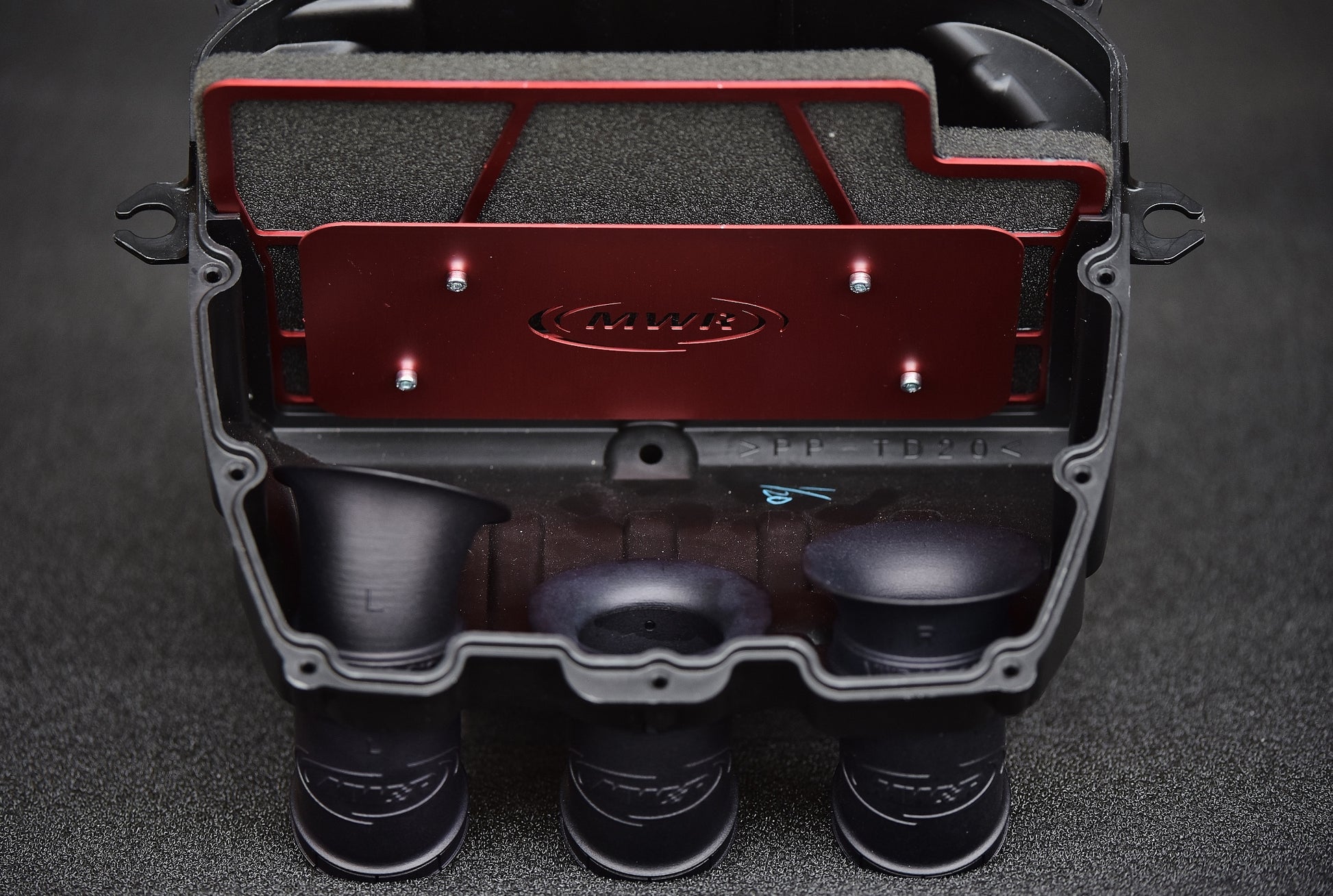 (L) trumpet must be placed on the left side, (R) trumpet on right side and the lowest trumpet in the middle. The stacks are two-piece and able to attach them neatly and properly into the airbox, for this we have also designed a click system so that everything stays securely in place when mounted.
