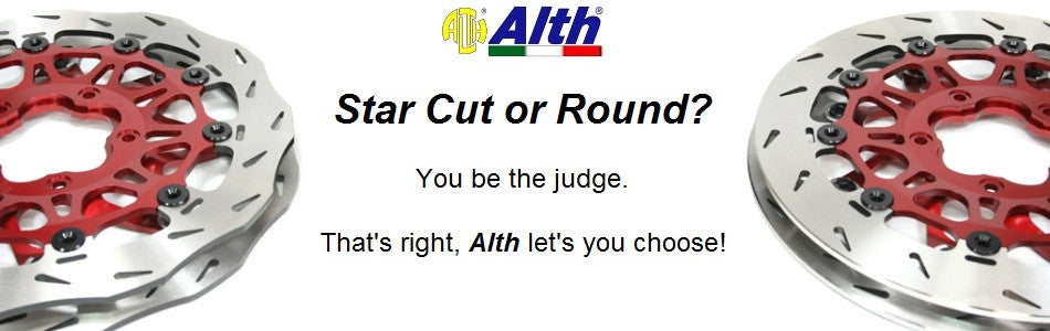 Alth floating brake rotors, available with your choice of a rounded, or star cut (wave style) rotor blade, and your choice of color for the rotor carrier, and the buttons!