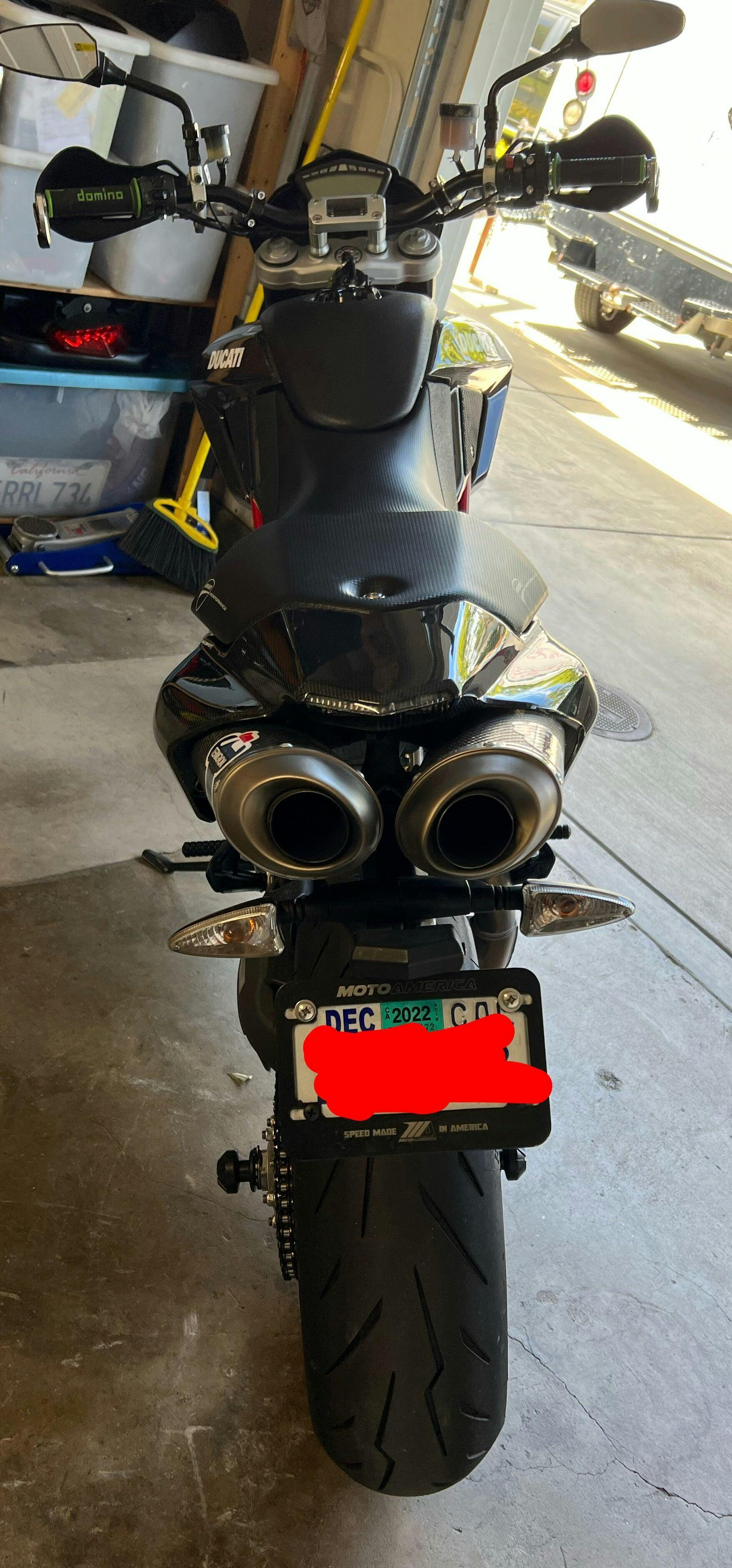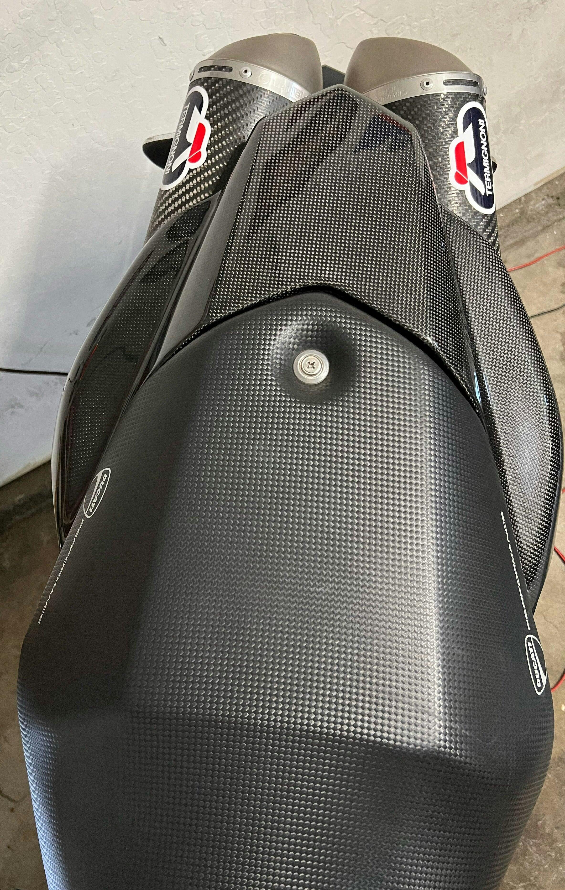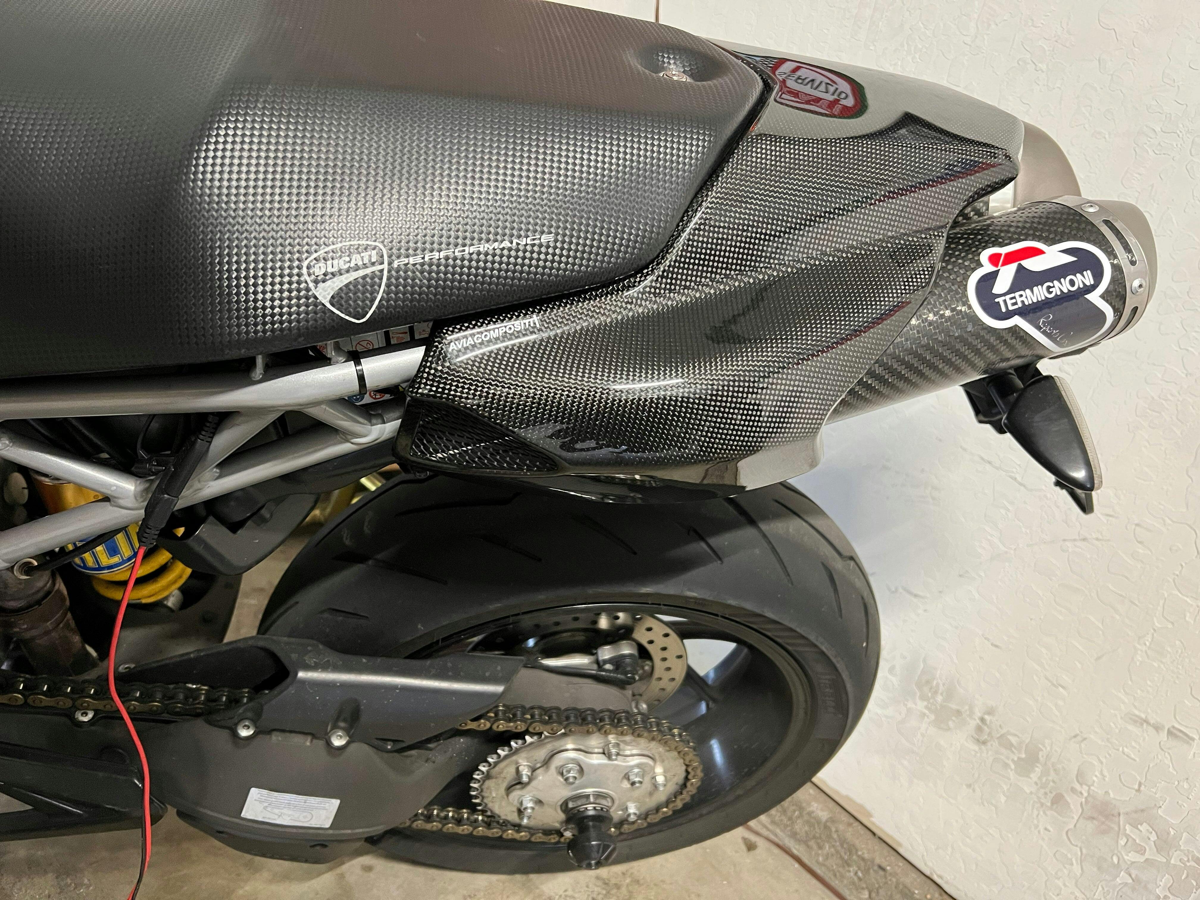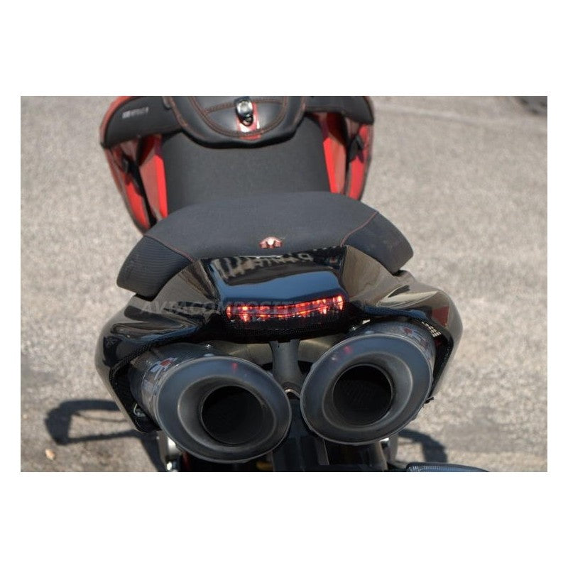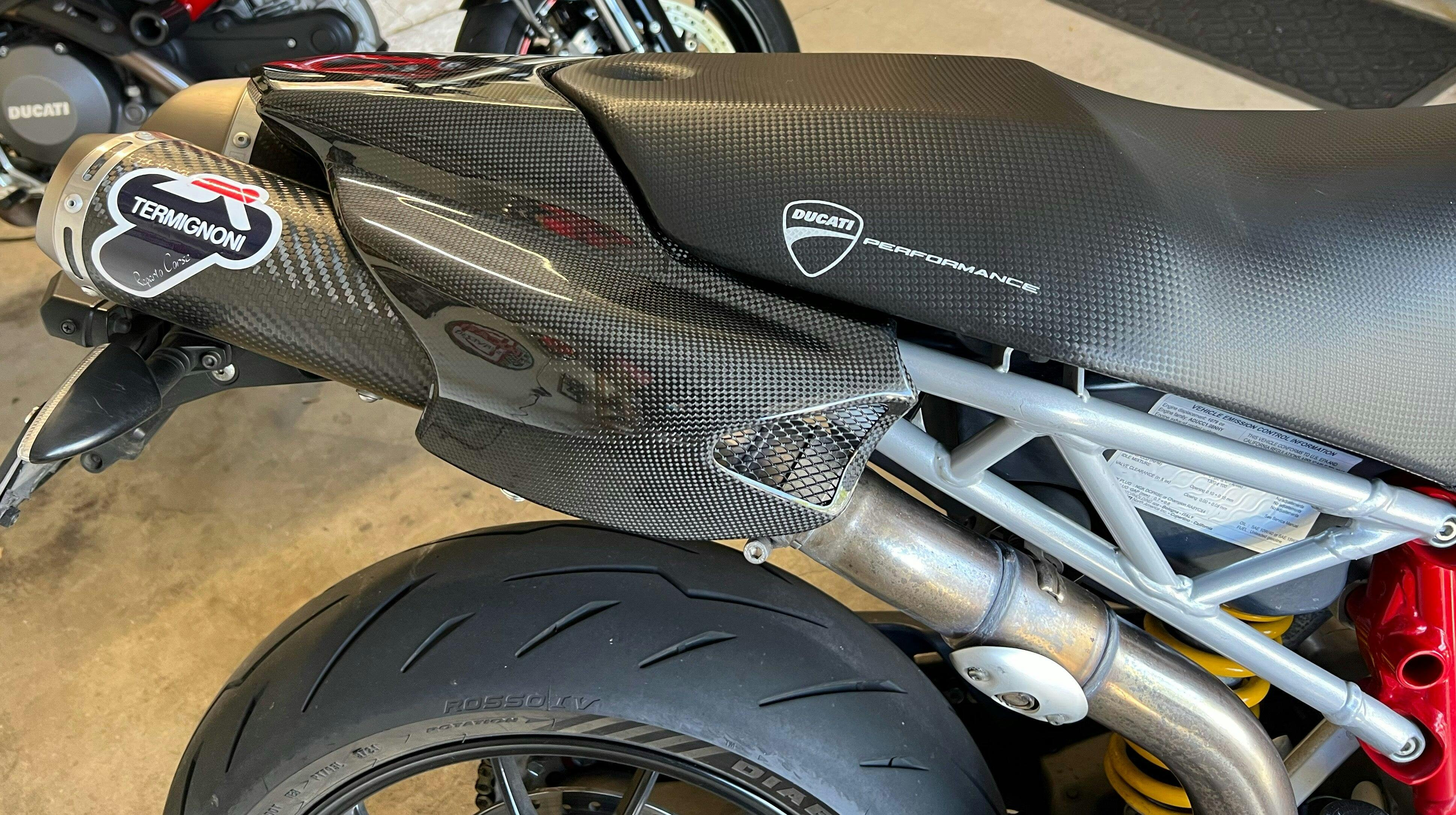 Works with the OE And all dual muffler exhausts and looks best with the Ducati "LOW" seat, but works with all seats