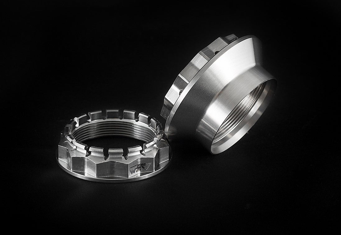 Two nuts (wheel side + sprocket side) made of CNC machined Titanium.