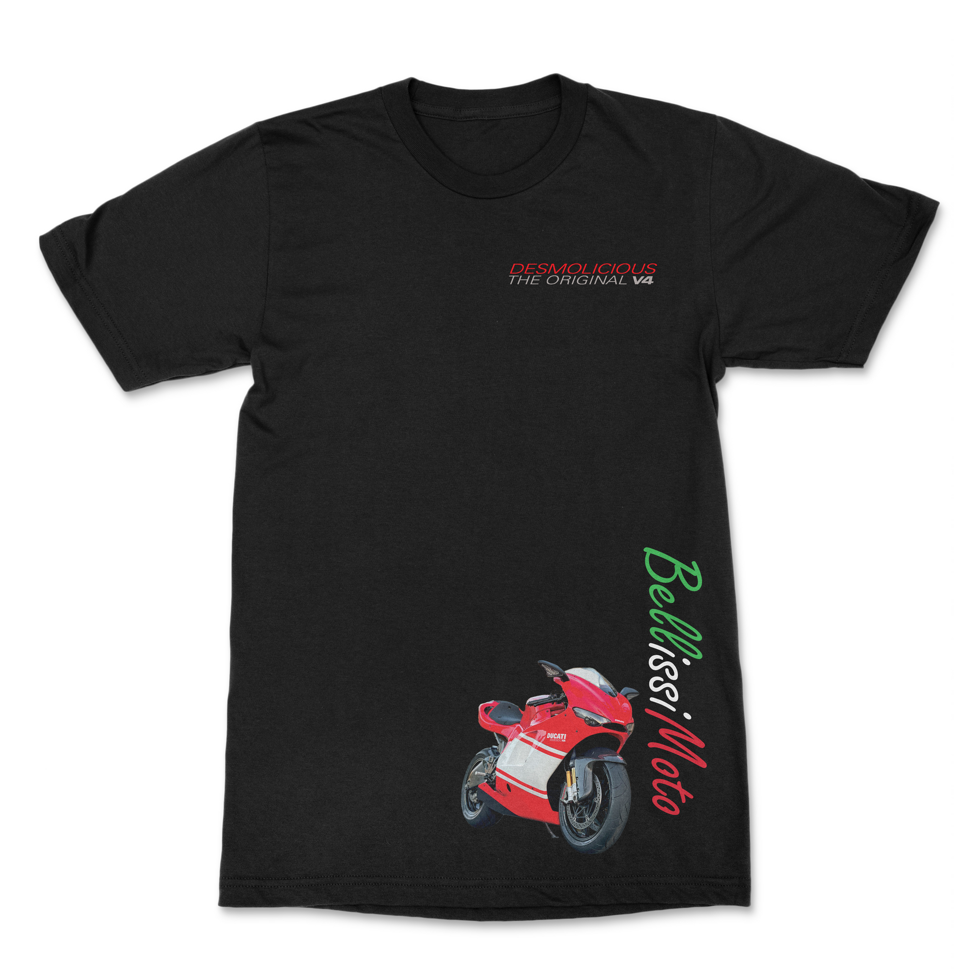 Celebrating the First V4 you could buy yourself, and one of our favorite rides! Our New Shirt Features the iconic Desmosedici 16RR, Our Bellissimoto logo Down the side, and our new favorite catch phrase on the Left side chest "DESMOLICIOUS - The Original V4"