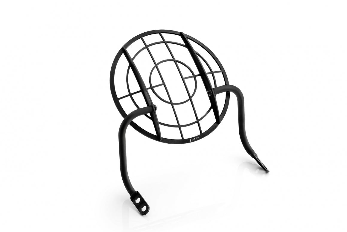 Rizoma offers this uniquely styled head light guard for your single round headlight. This strong metal guard not only looks the part, but offers valuable protection to your motorcycle.
