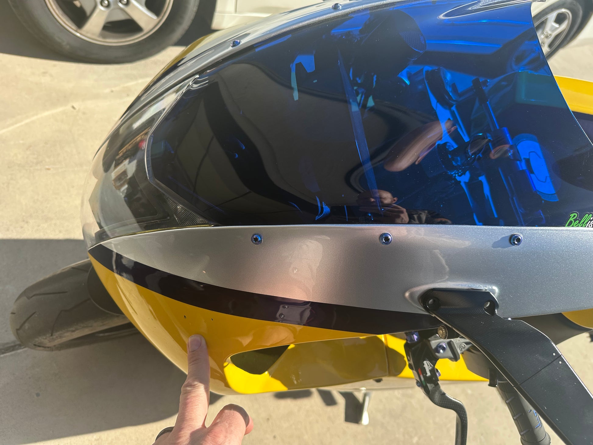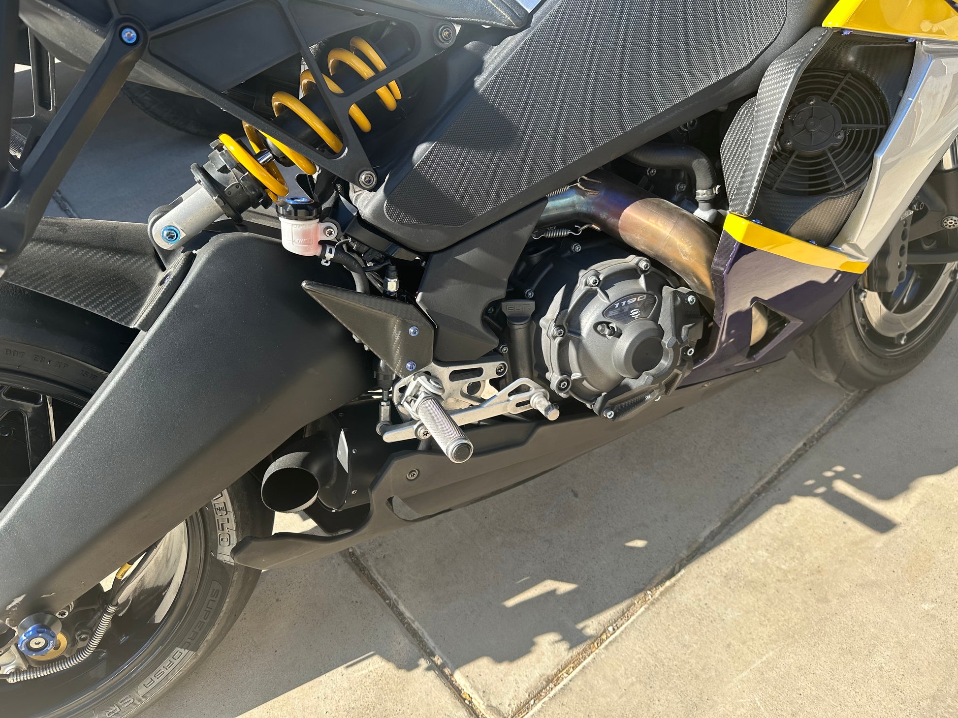 The Swing arm shimming kit, allows for precise alignment of the swing arm and chain and rear sprocket to the front sprocket. these are frequently slightly off from the factory. This Kit allows for better longevity and wear. It has beautiful, custom painted Full carbon body (except the belly pan) with the expose carbon Painted with a purple pearl that mimics color shifting paint and ha an almost 3D effect when you look at the Pegasus's on the side.