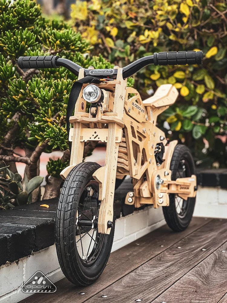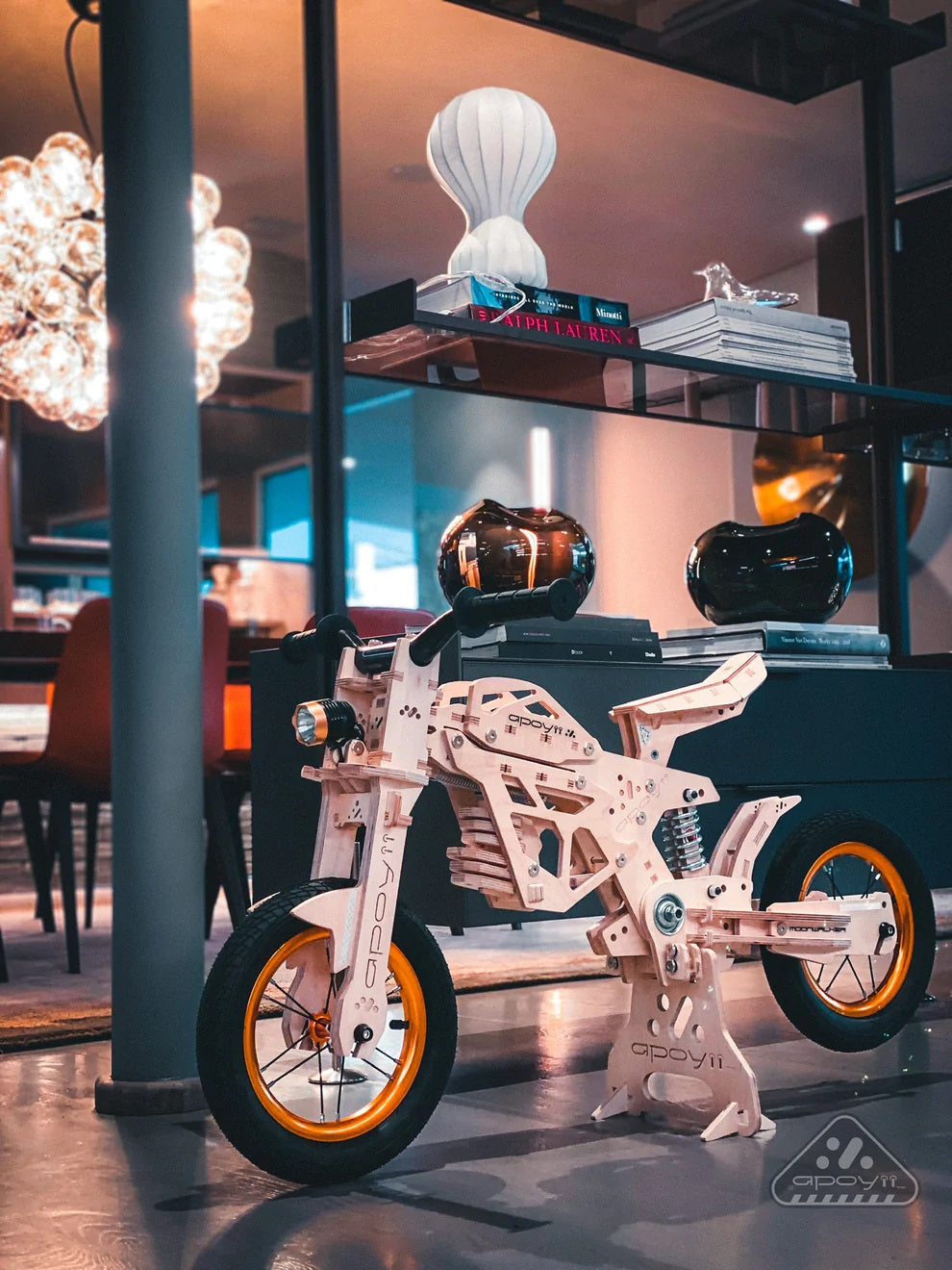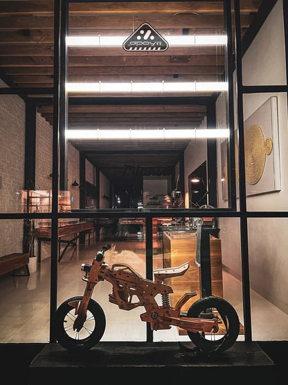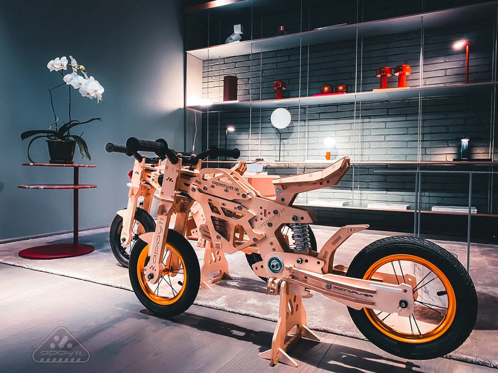 Likewise, APOYII's designer Gustavo Penna (a long time Ducati rider, builder, and customer of BellissiMoto), pays homage to his sources of inspiration and deepest influences in the world of design, art, music, aesthetics and functionality of his very own interpretation of what the perfect wooden push bike should be like. Taking into account that we had to incorporate our thinking into a younger generation that the most ecological, practical, healthy, versatile, sustainable and used transportation vehicle in the world, is the bicycle.