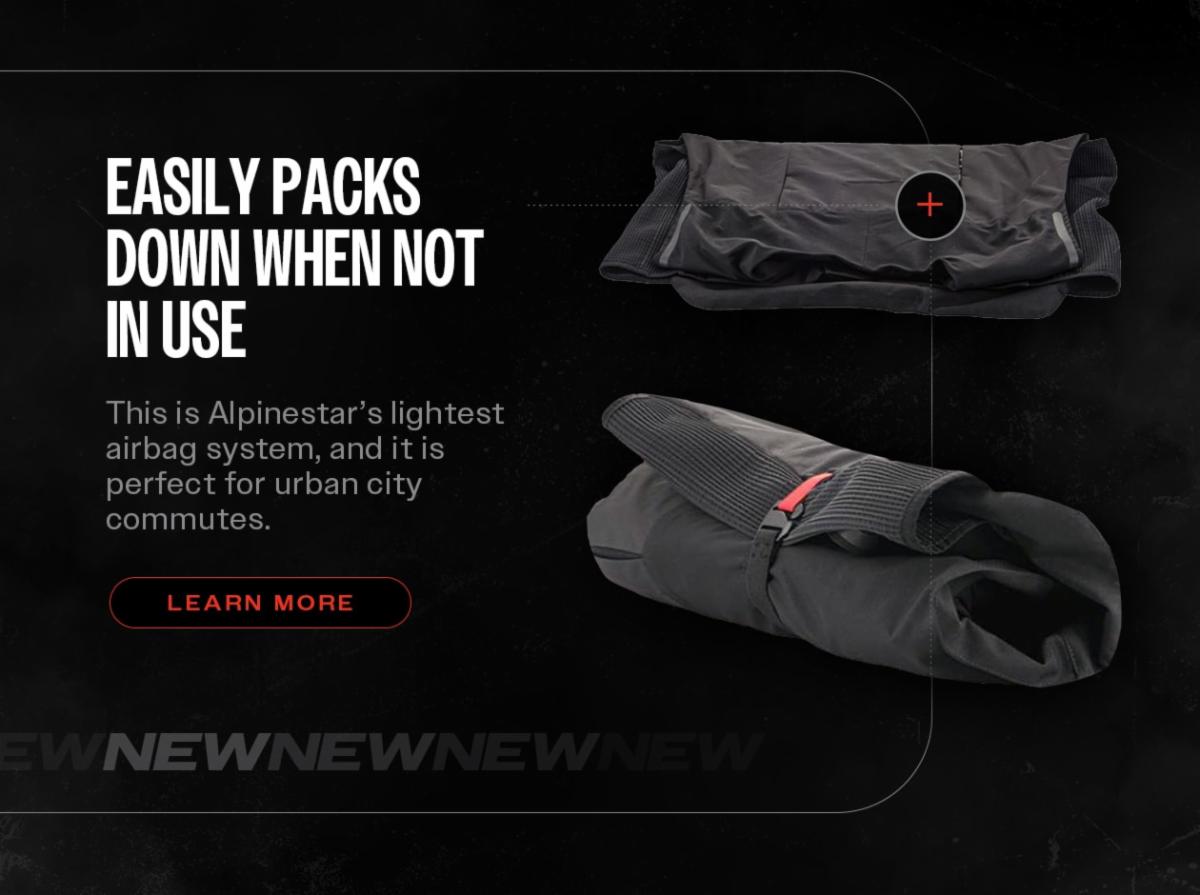 • An internal magnetic button facilitates easy positioning of the airbag across the chest when riding.