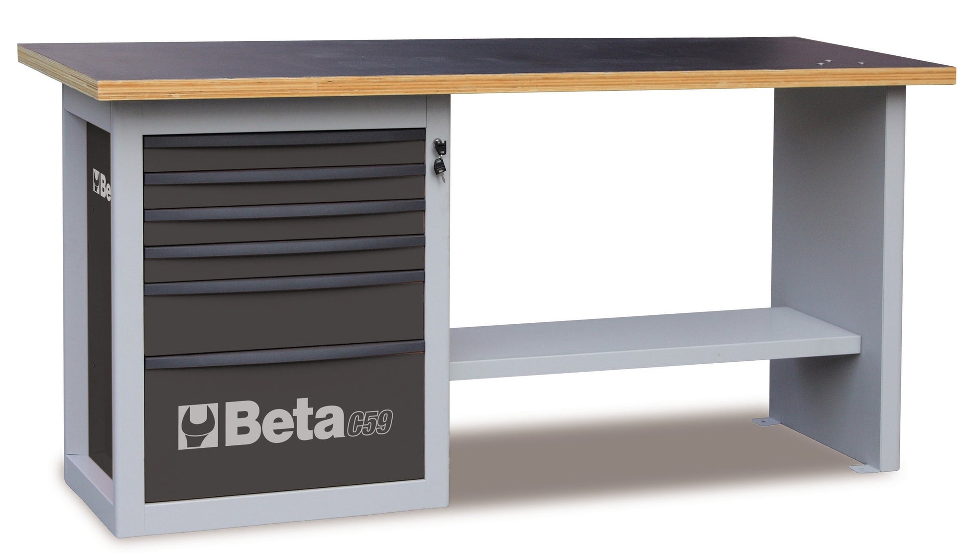 Worktop made from multi-ply wood with holes for vice item 1599F/125 (to be ordered separately).6 drawers (588x367 mm) with ball bearing slides:4 drawers, 70 mm high1 drawer, 140 mm high1 drawer, 280 mm high.Drawers protected by foamed rubber mats.Hard-wearing nylon drawer front.Roller cabs can accommodate thermoformed trays.