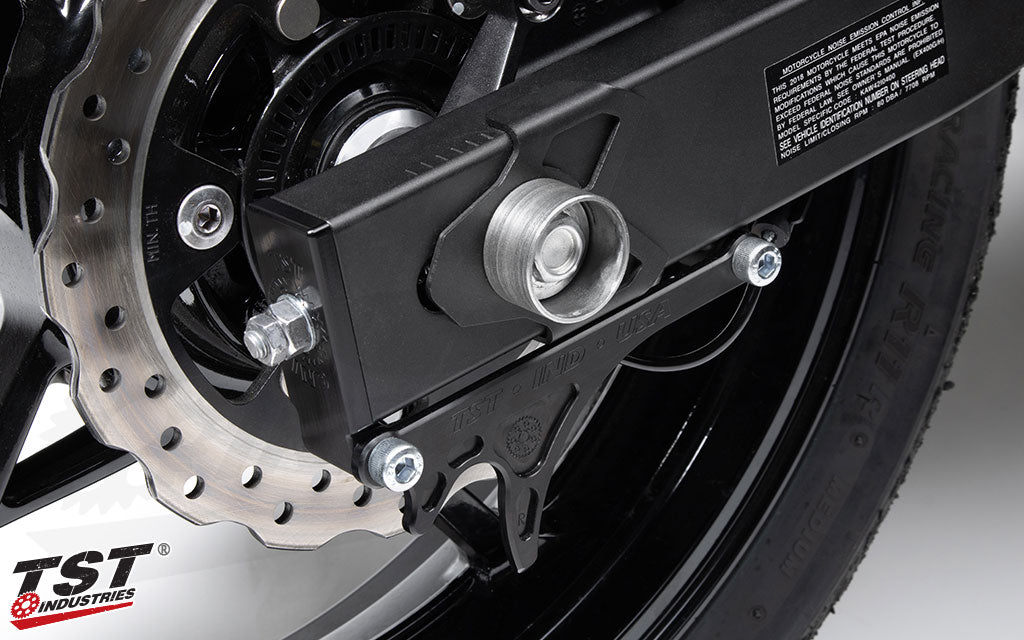 Our TST Race Team currently has a 2018+ Kawasaki Ninja 400 in the lineup, which means that we are regularly changing tires and removing the rear wheel both at the track and in our shop. Due to it being a dedicated race bike, we removed the kickstand and depend on a safe and secure way of lifting the bike on a rear paddock stand for storage, parking, and maintenance. Our engineers wanted to make that process easier and safer, not only for our guys on the track, but for everyone with a Ninja 400 or Z400 in their home garage or race track paddock. That's why we designed the Captive Chain Adjuster and GP Lifter System. The GP Lifter bracket provides the captive functionality, keeping the chain adjuster retention blocks in place while removing or installing the rear wheel. This feature makes the entire process faster and easier as you don't have to worry about the chain adjusters falling out or moving during the procedure. Each component is crafted from CNC machined aluminum with a durable black anodized finished. Whether you're at the track or prepping for your weekend ride, this system provides valuable assistance in making your rear tire changes and wheel maintenance a quick and easy job.