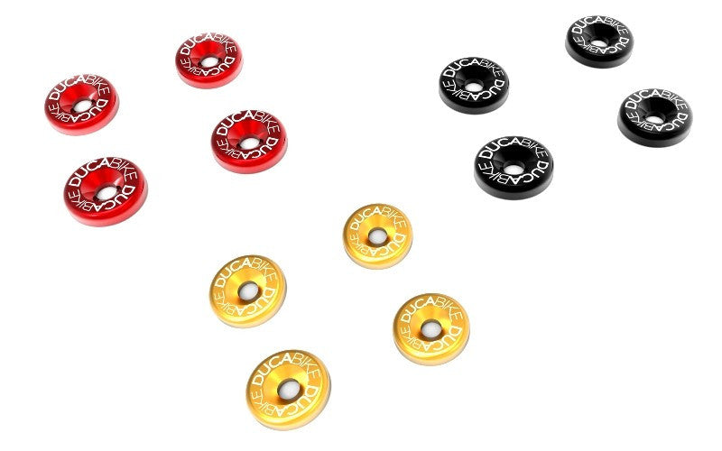 Beautifully machined from billet aluminum, then anodized and contrast cut for a very unique, exclusive look! Available in Red, Gold, or Black. 4 piece kit (enough for both sides).