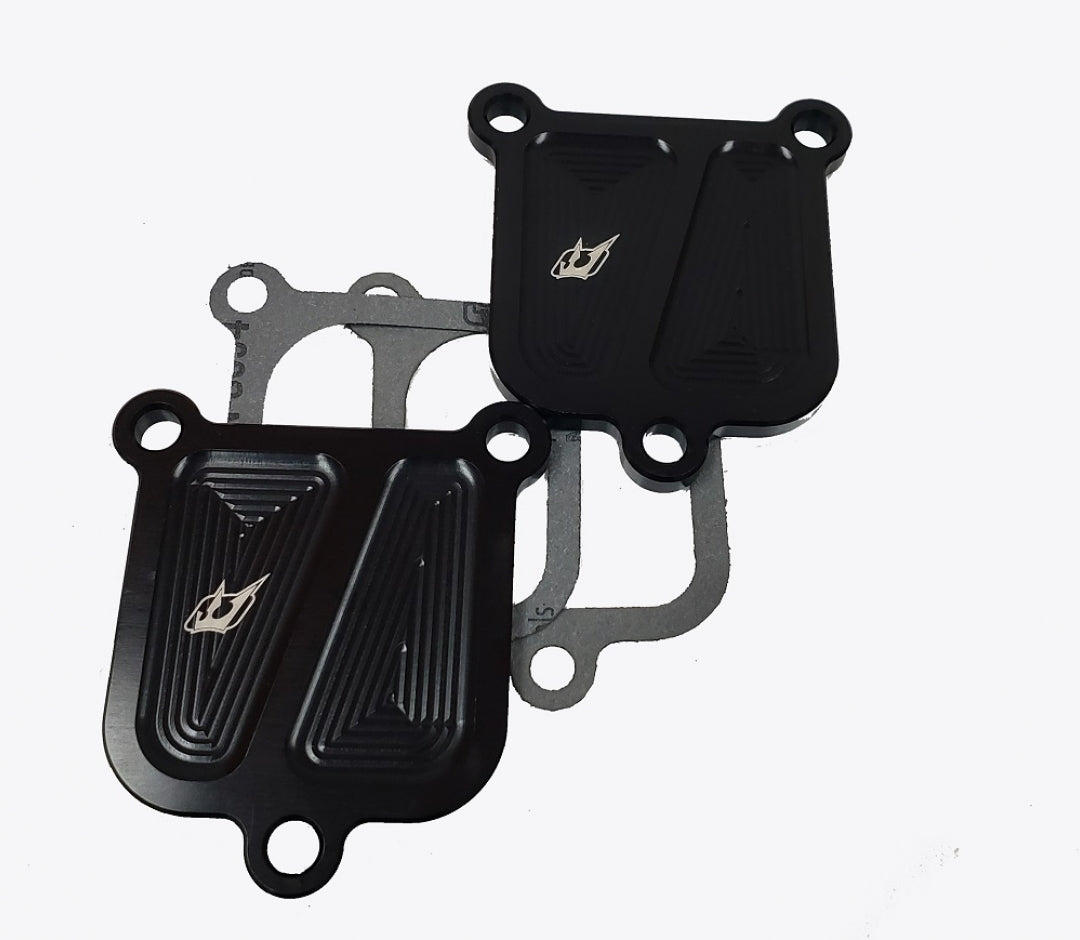 Driven's engine block off plates will stop the annoying and possibly damaging backfires from occurring while allowing you to remove a few pounds in associated valves and hoses from your bike.