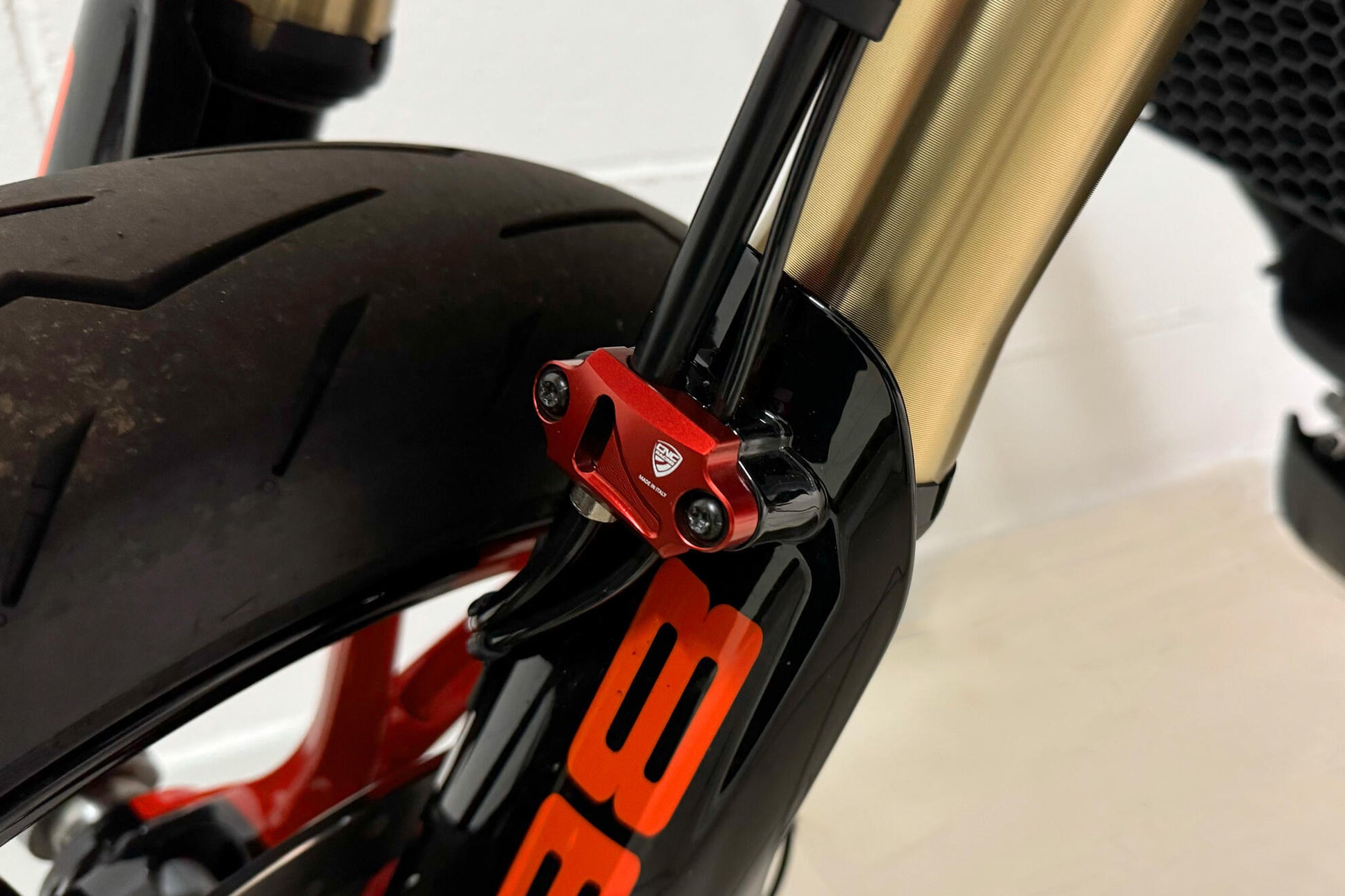 Front Brake line cover made in light alloy, machined from solid Billet and then anodized. It replaces the original in plastic material without any modification.