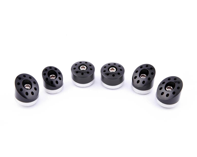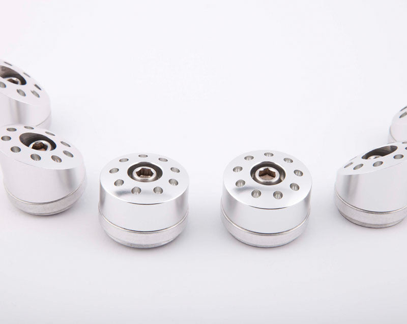The kit is composed of 10 plugs that are fixed to the frame through expansion by means of conical bushing, metallic o-ring, and stainless steel screw on the Aluminum Plugs or a titanium screw on the Titanium Plugs.