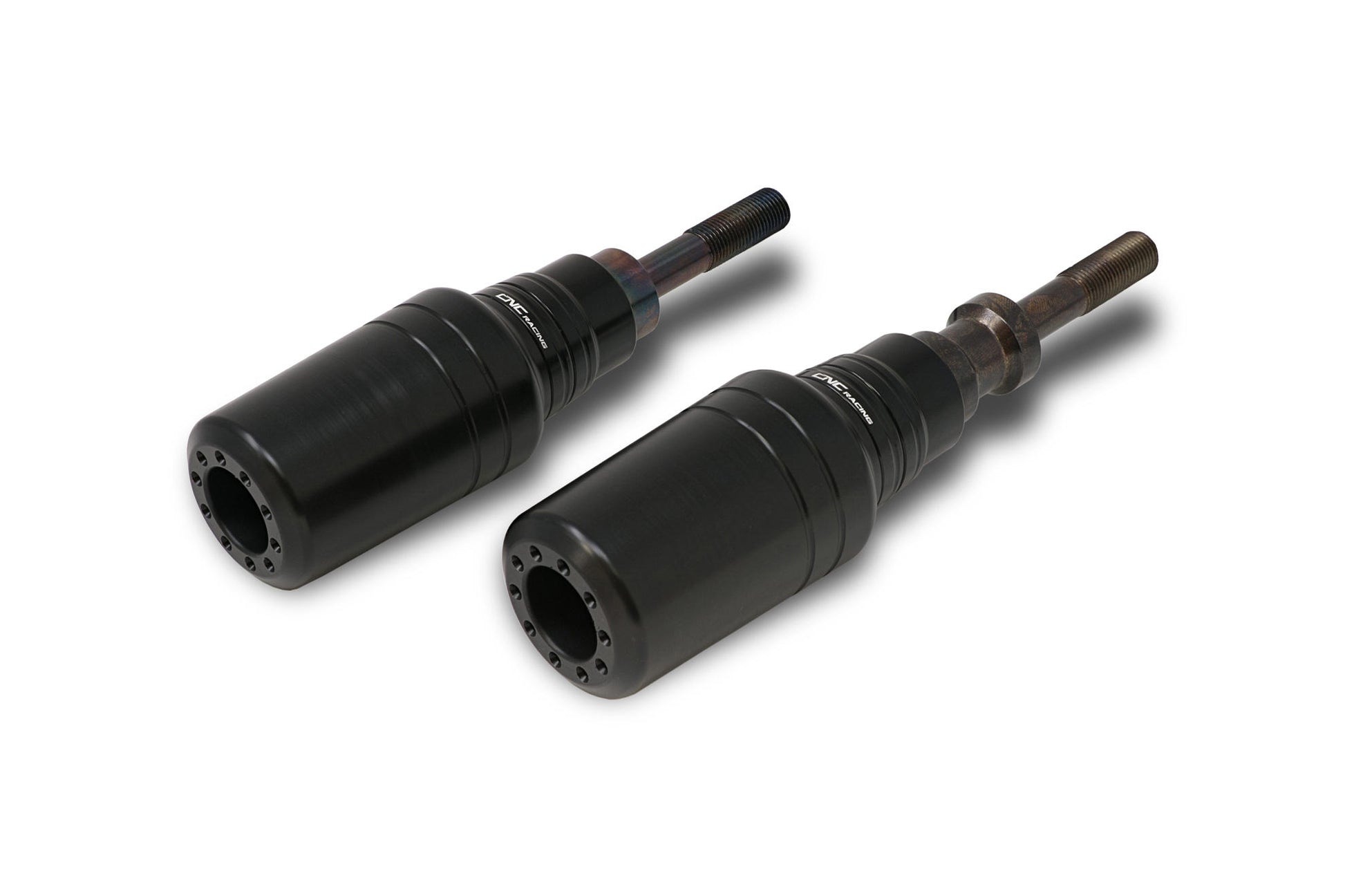 Made from Billet Delrin, these sliders look fantastic and do the job! They feature an Aluminum Base and Ring in one of three colors to personalize your bike and the Hardware is a Stainless Rod and Bolts!