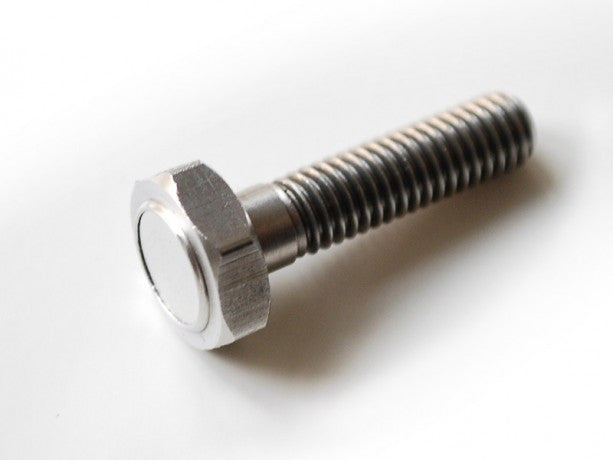 This M6 bolt, 24mm long, has a magnet embossed in the hex head. The bolt is designed as a replacement brake rotor bolt functioning as a a reed contact for the speed sensor for any motogadget instrument.