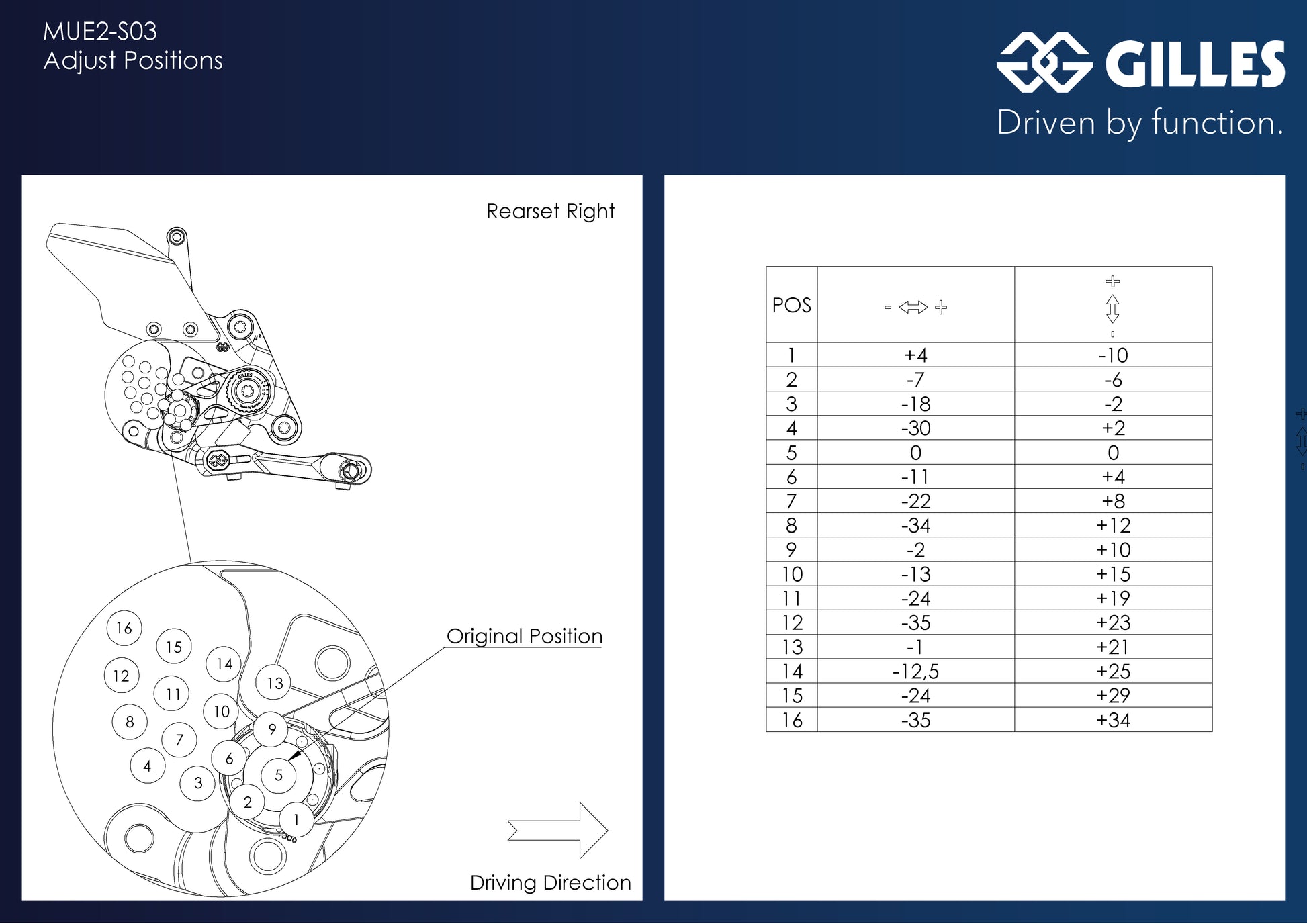 New generation of rearsets from Gilles Tooling! Futuristic design meets simplified adjustability. Unique feature of the MUE2 Rearset is that the footpegs are positioned by a single point combination adjuster, which allows you to slide and rotate the footpeg to desired location for fast, precise, and repeatable results.