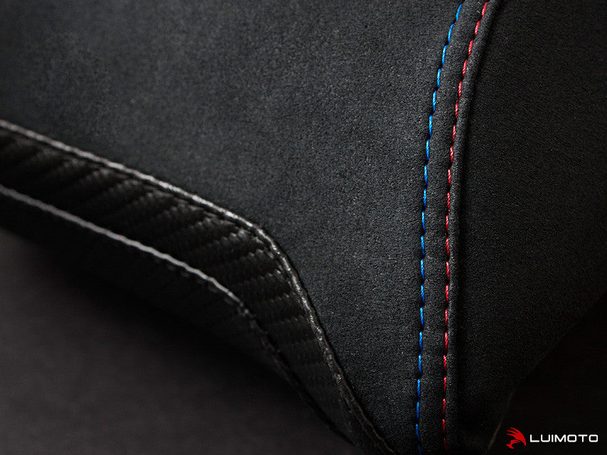 The R1200RS Motorsports seat cover features our luxurious synthetic suede, tec-grip pads, BMW style M stripes, red and blue contrast stitching, along with carbon fiber and perforated-look vinyl to complete the look of your motorcycle. Riding surface also available in our marine grade SP vinyl.