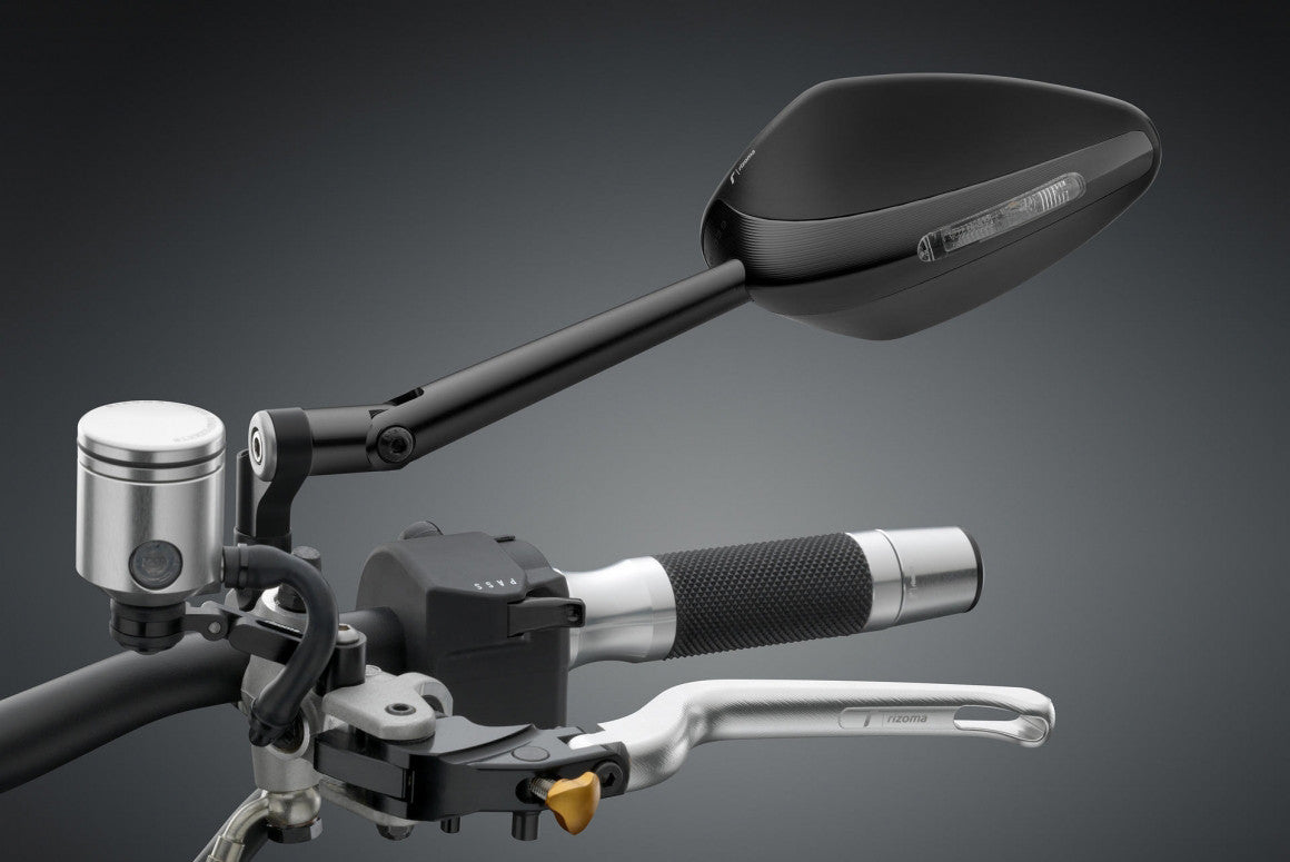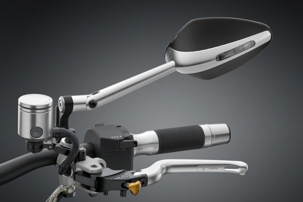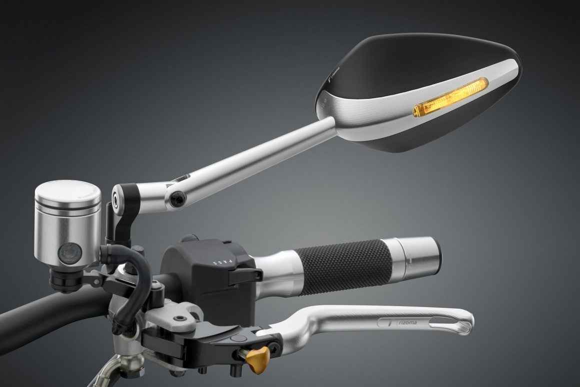 This newly designed mirror adds a new dimension to the line of RIZOMA mirrors by the integration of a turn signal. Different materials and surface finishes combined to create a sleek and simple design, ensuring a final effect of absolute aesthetic value. Thanks to its convex and glare resistant glass and wide reflective area in line with European homologation standards, the mirror provides a great view.