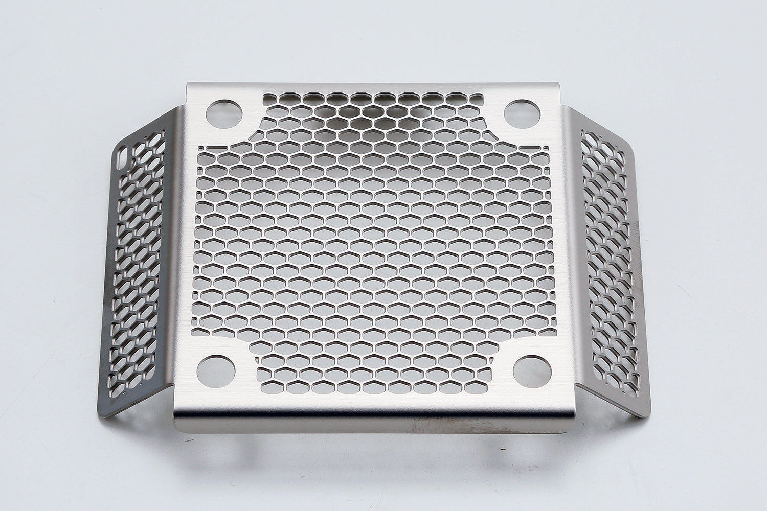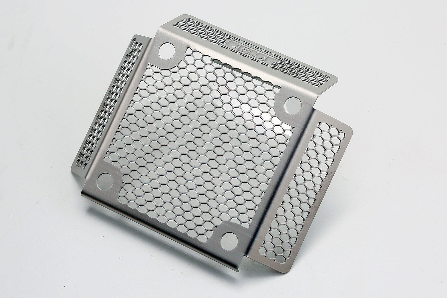Since the oil cooler of SCRAMBLER is arranged so as to be offset to the outside more than the center line of the body, considering both of the cooling effect and the protection effect, it is assumed that the winding of the front wheel is supposed to be many, Small fine eyes with a high protection effect, the portion where the running wind farther from the body center ( outer side ) fits well, arrange the coarse eyes in a stepless manner so as not to impair the cooling effect.