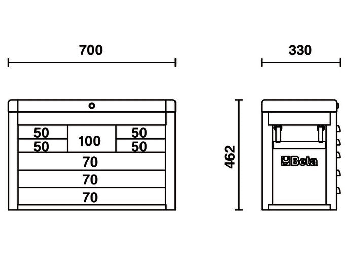Eight drawers with ball bearing slides: 4 drawers, 50 mm high - 3 drawers, 70 mm high -1 drawer, 100 mm high.Front centralized safety lock.Retractable side handles for ease of transport.