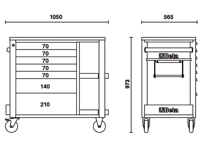 Seven drawers (588x367 mm) with ball bearing slides: 5 drawers, 70 mm high, 1 drawer, 140 mm high, 1 drawer, 210 mm high.Drawer bases protected by foamed rubber mats.Four castors 125 mm in Ø: 2 fixed and 2 steering (two with brakes).Front centralized safety lock.Static load capacity: 1.100 kg.Multi-ply wood worktop with holes for a vice (1599F/100, to be ordered separately).Side compartment with vertically adjustable top.Integrated paper roll holder.