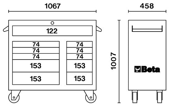 Eleven drawers with ball bearing slides:1 drawer 937x410x122 mm3 drawers 570x410x74 mm2 drawers 570x410x153 mm3 drawers 313x410x74 mm2 drawers 313x410x153 mm.Drawer bases protected by foamed rubber mats.Static load capacity: 1200 kg.