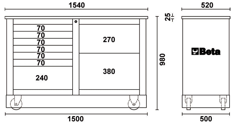 Multi-ply wood worktop4 castors, Ø 125 mm2 fixed and 2 steering (one with brake), with exposed coveringStatic load capacity: 1200 kg7-drawer module588x367 mm, with ball bearing slides6 drawers, 70 mm high1 drawer, 240 mm high