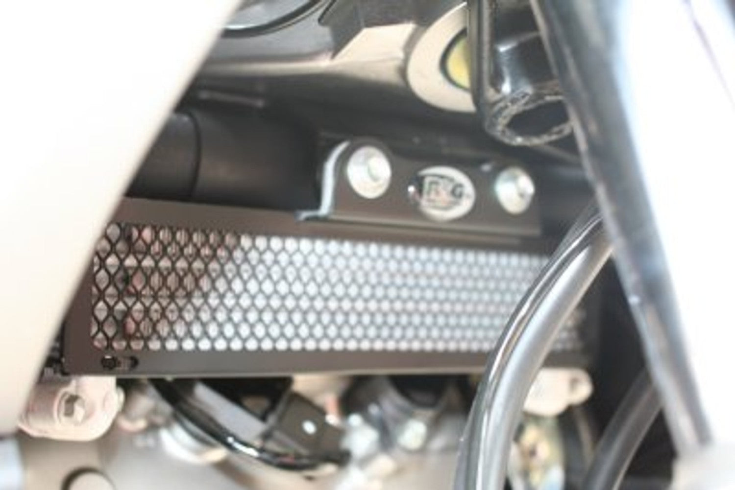 R&G Oil Cooler Guards are available in a black finish. They are made from pressed aluminium and feature a neat, seamless frame. They improve the looks of your bike and help to protect your expensive and vulnerable oil cooler from flying debris.