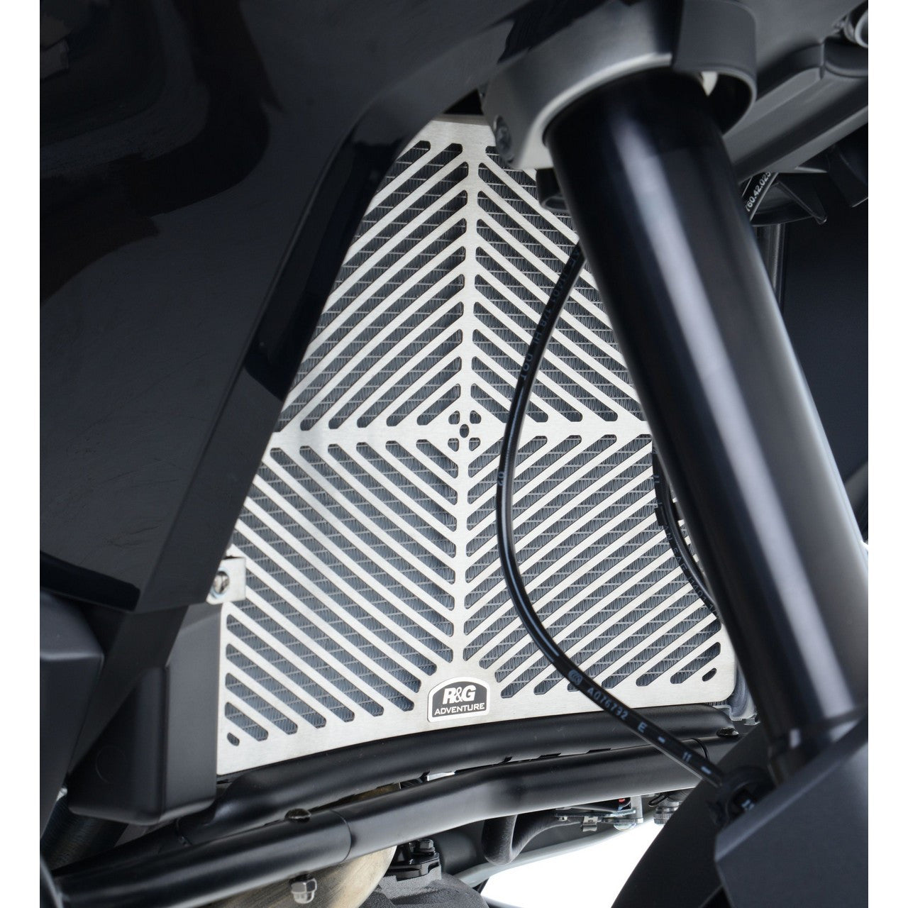 The R&G Stainless Steel Oil Cooler Guard series is tougher and sleeker looking than it's aluminum counterpart. Constructed from a 1mm thick sheet and laser cut, the grill is designed to be strong, look great and maximize air flow to cool the vulnerable components on your bike. This rust resistant oil cooler guard is made for the rider who loves an adventure in any type of challenging terrain.