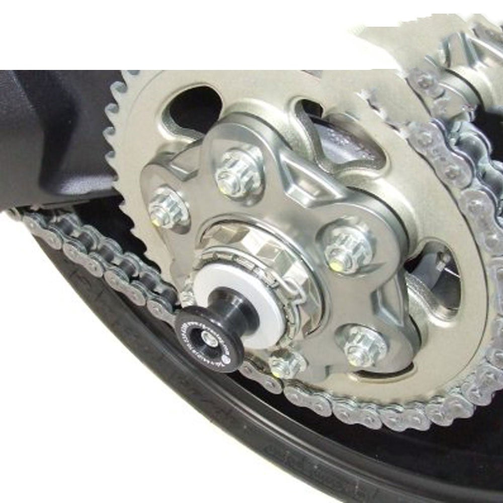 R&G Rear Axle Sliders / Protectors is an axle through-bolt design that pulls double duty as a axle and swing arm protector and a spool stand to pick up the rear end for routine adjustments, storage and cleaning.