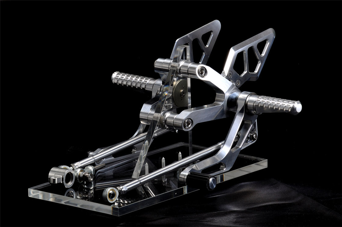 Inherited the popular eccentric adjustment mechanism for 1098, it can easily perform position change and left / right positioning of 8 places. The step base was cut with a diamond cut pattern and sticking to details of exterior appearance. In addition, the pedal adopts an L-shaped type that also uses a racer, reducing operational errors at the time of banking. It is also possible to change the lever ratio and adjust the distance between the step bar / pedal tip. In addition, a pillow ball mounting hole exclusive for reverse change is prepared for the change pedal.