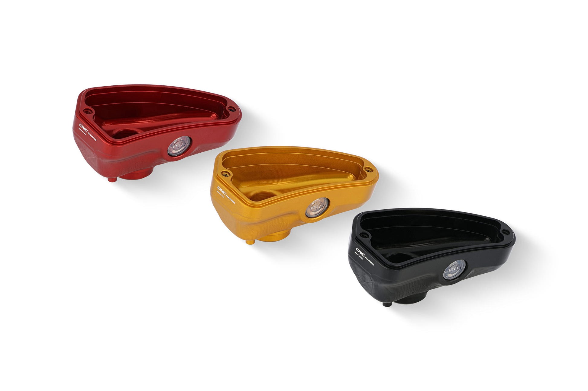 CNC Racing's Clutch Fluid reservoir with level window is CNC machined from light alloy billet and then given a colored anodized surface finish, which, in addition to coming in a wide range of colors, delivers quality and lasting service life.