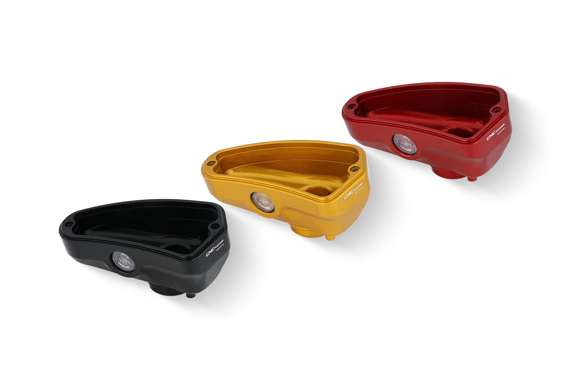 CNC Racing's front brake Fluid reservoir with level window is CNC machined from light alloy billet and then given a colored anodized surface finish, which, in addition to coming in a wide range of colors, delivers quality and lasting service life.