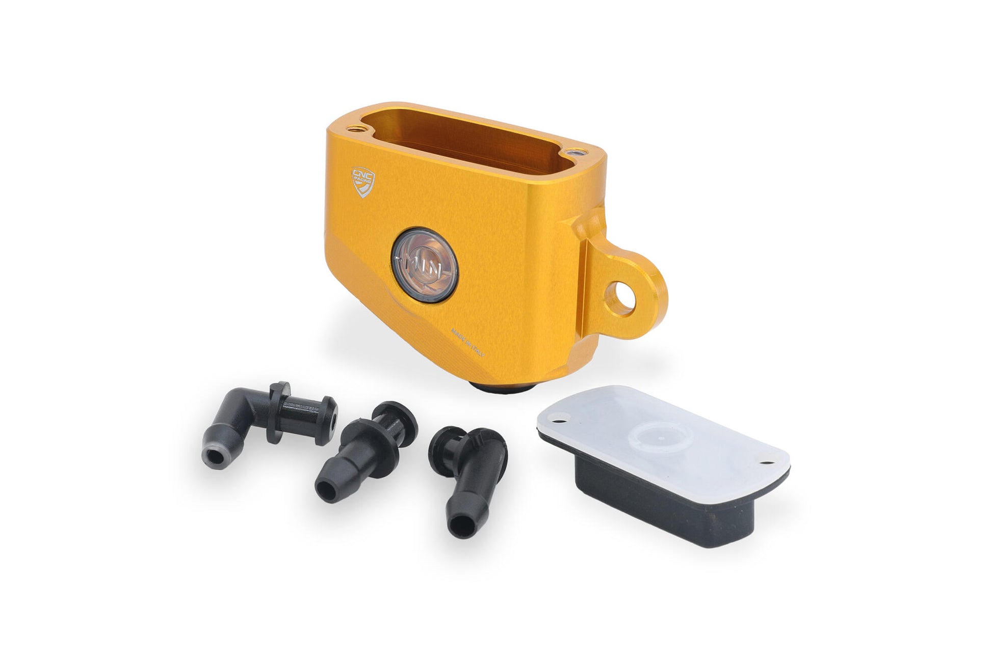 CNC Racing's rear brake Fluid reservoir with level window is CNC machined from light alloy billet and then given a colored anodized surface finish, which, in addition to coming in a wide range of colors, delivers quality and lasting service life
