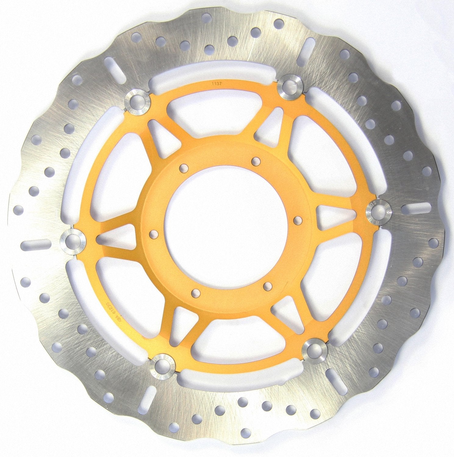 Ultra lightweight EBC Brakes X series floating front MC rotors since their introduction, have become one if the worlds best selling lightest and best performing discs available for all modern sport bikes. Floating MC rotors feature EBC Brakes unique and patented S-Drive button system which features square sided rivets captured in square drive pockets on the rotor and hub which allow the outer rotor blade to expand and contract freely under the heat of braking without suffering rivet lock.