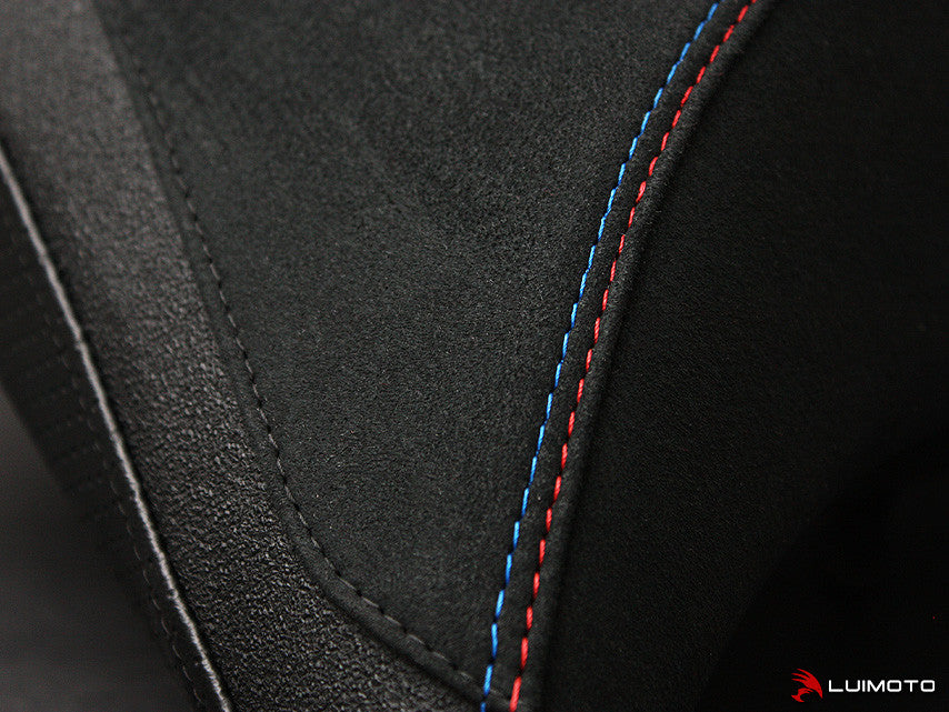 The R1200GS Motorsports seat cover features high performance materials and our take on the famous BMW M stripe design. Carbon fiber and perforated-look vinyl along with a luxurious synthetic suede riding surface complete the look of your R1200GS. Riding surface also available in our marine grade SP vinyl.