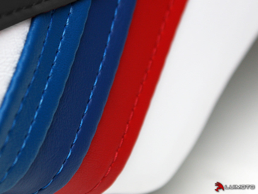 The F800GS Motorsports seat cover features our Tec-Grip vinyl. Tec-Grip provides additional grip around the thigh area for high performance riding. BMW M stripes, carbon fiber and perforated-look vinyl complete the aggressive look of your F800GS.