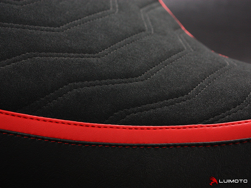 The Ducati Multistrada Team Italia seat cover is hand made with all our finest materials. A unique technical ribbing pattern is stitched onto our luxurious suede riding surface. Red borders run parallel throughout the seats to add a bold Ducati-esque statement. Finally carbon fiber textured vinyls stitched in red finish off the design. This is the ultimate expression from Luimoto to your Multistrada. Riding surface also available in our marine grade SP vinyl.