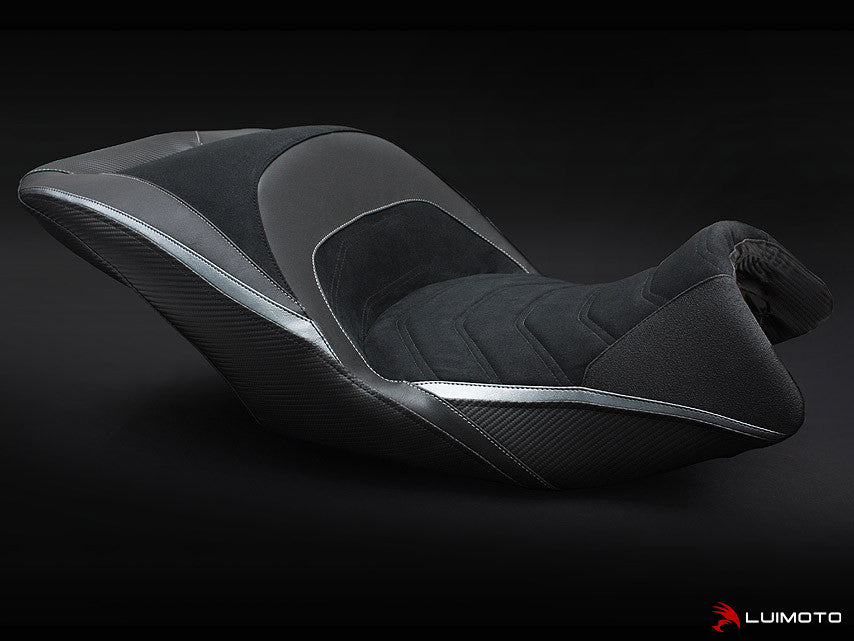 The BMW K1600GTL Luimoto Seat Cover is hand made with all our finest materials. A technical ribbing pattern is stitched onto our luxurious suede riding surface. Carbon fiber and leather look marine grade vinyls compliment the lines of the K1600GTL. Tec-grip is used liberally on the thigh areas for an enhanced riding experience. Stand out with the finishing touch of Luimoto! Riding surface also available in our marine grade SP vinyl.