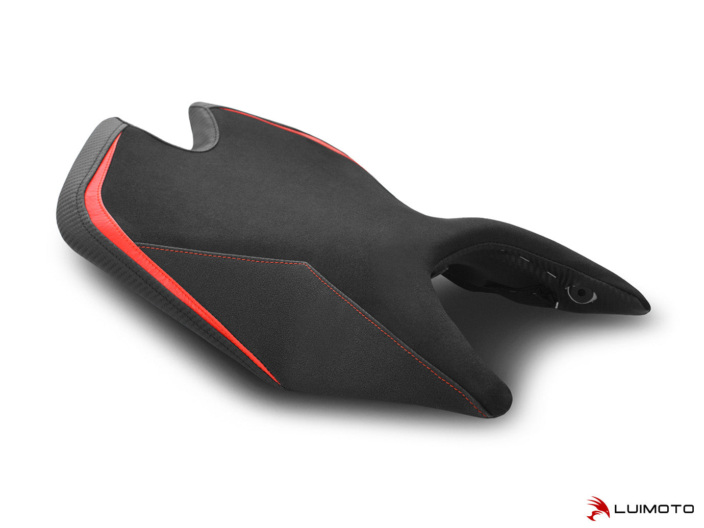 Introducing the Veloce rider seat cover for the Aprilia RS 660 and Tuono 660! The Veloce Seat Cover was designed to mirror the speed and aggressiveness of the bike. Featuring Tec-grip side pads, rear carbon fiber sections and fire red contrast stitching. The premium synthetic suede riding surface is framed with sleek and aggressive racing stripes. Stand out with Luimoto!