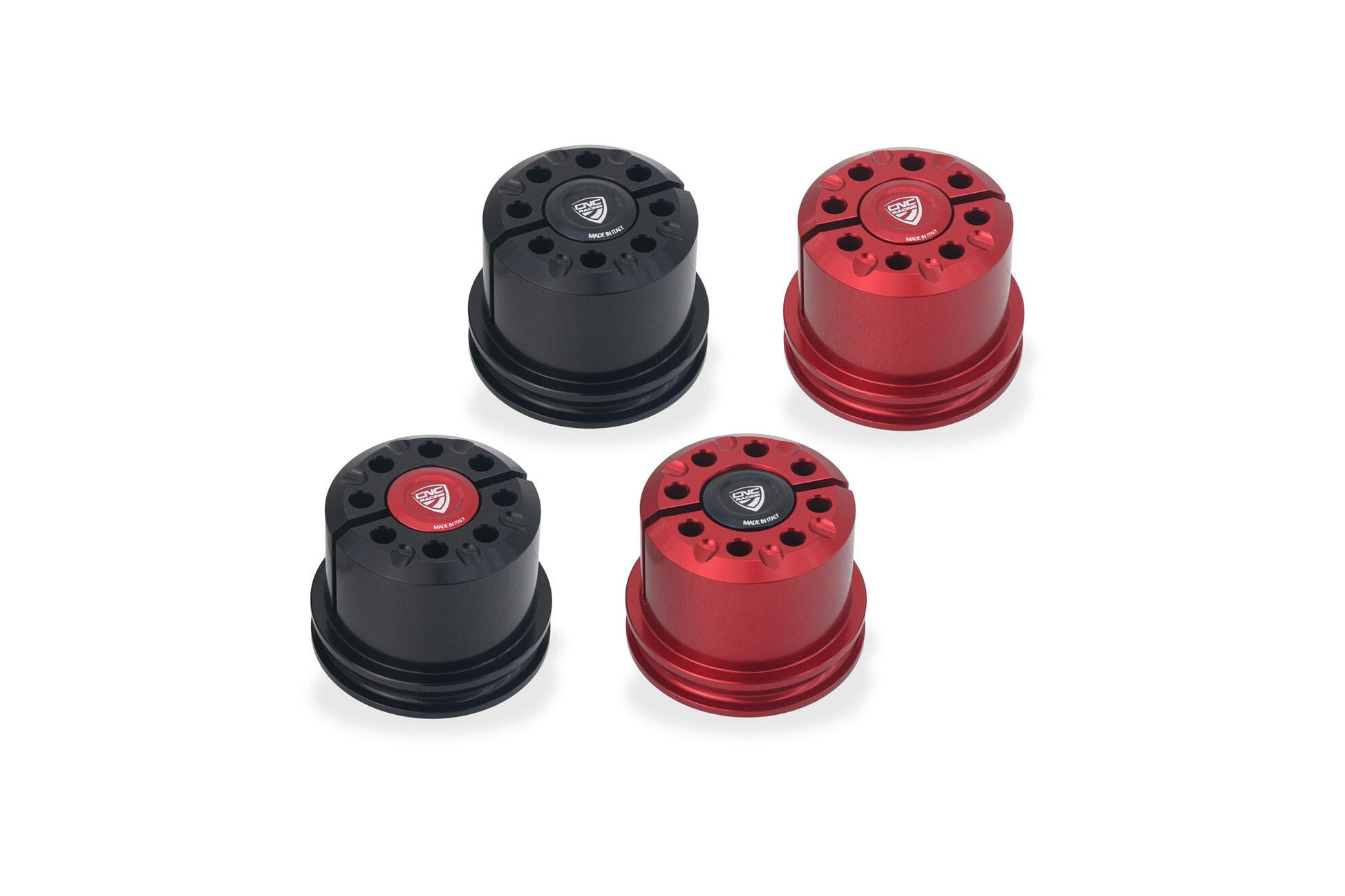 CNC Racing's Steering Head Nut for the Ducati - machined from light alloy billet and then given an anodized surface finish. Then a Matching Center cap is added after install with the CNC Shield Beautifully displayed