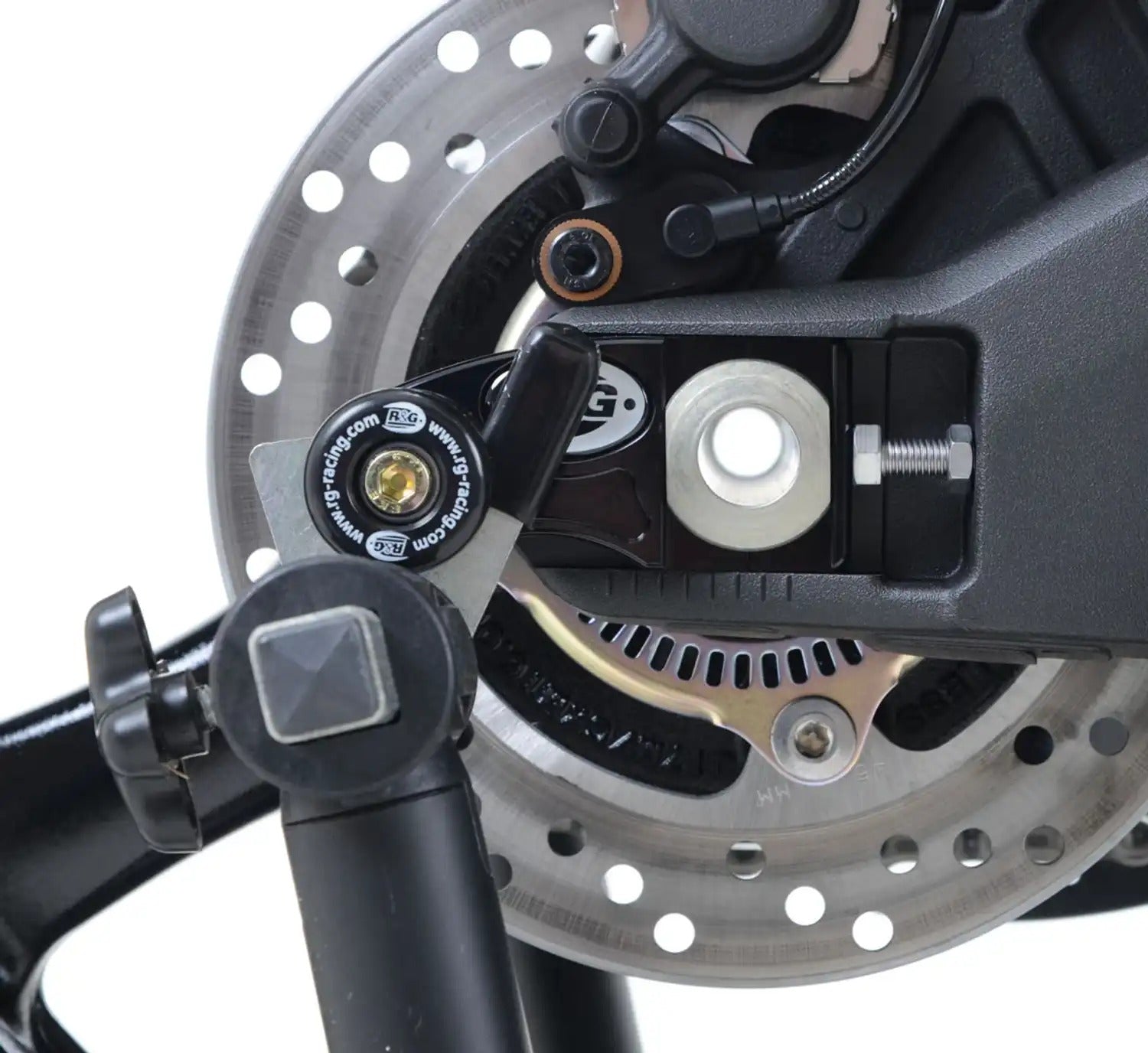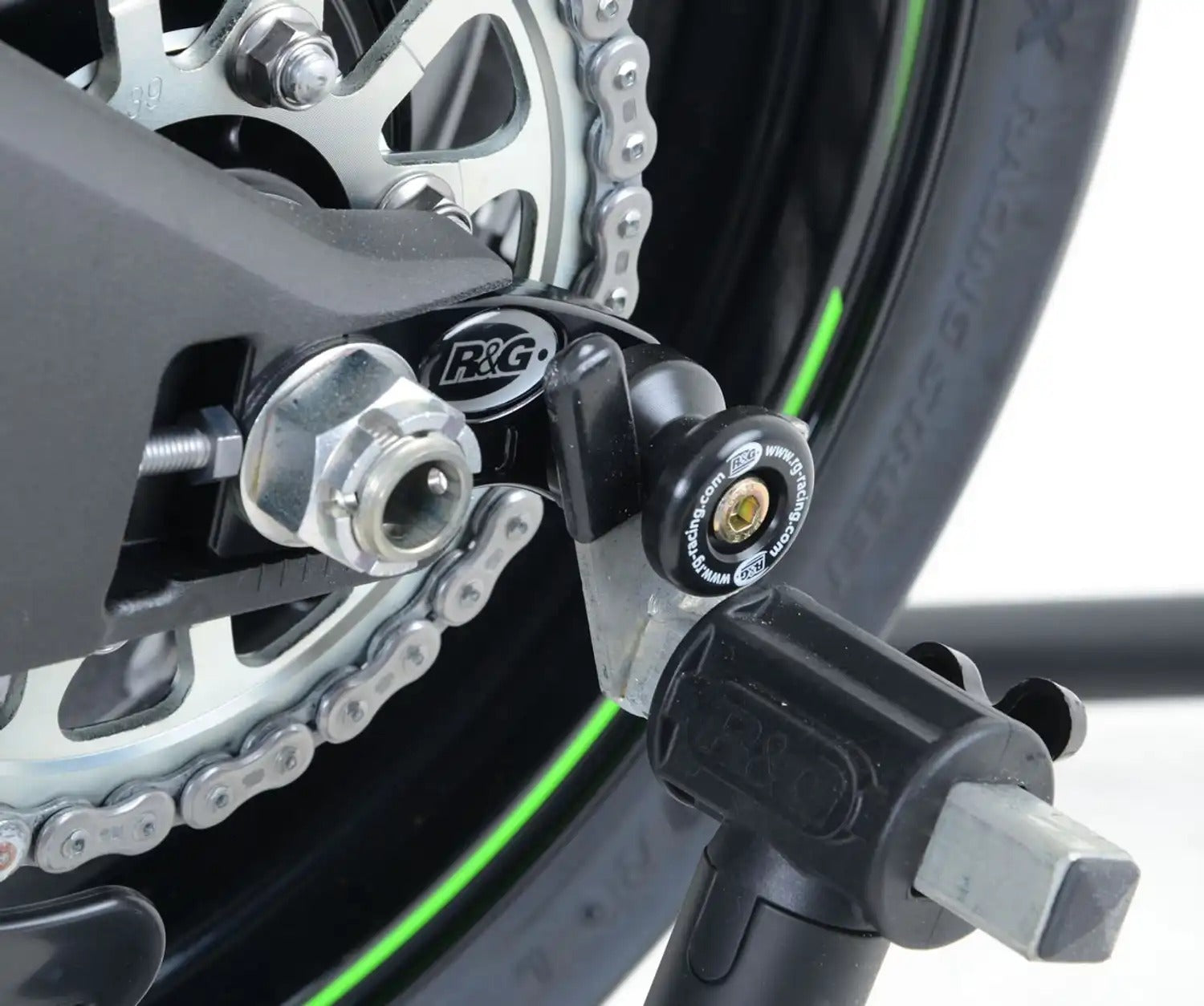 R&G Offset Cotton Reels directly replace the OE chain adjusters on the rear swingarm, off-setting the cotton reel mounting point from installed directly into the swingarm, instead into a specially machined metal bracket. Offering the best of both worlds in terms of crash protection and functionality with the ability to use the R&G Offset Cotton Reels bobbins as paddock stand bobbins, for maintenance and tyre changes as well as offering crash protection to the rear wheel components. These Offset Cotton Reels are designed to replace the OEM chain adjuster blocks, offsetting the cotton reel installation point further rearward, this is because, under extreme riding condition, the OEM/Aftermarket exhausts have been known to impact with a standard sized (traditionally swingarm mounted) cotton reel. Available in BLACK only - Sold in pairs.