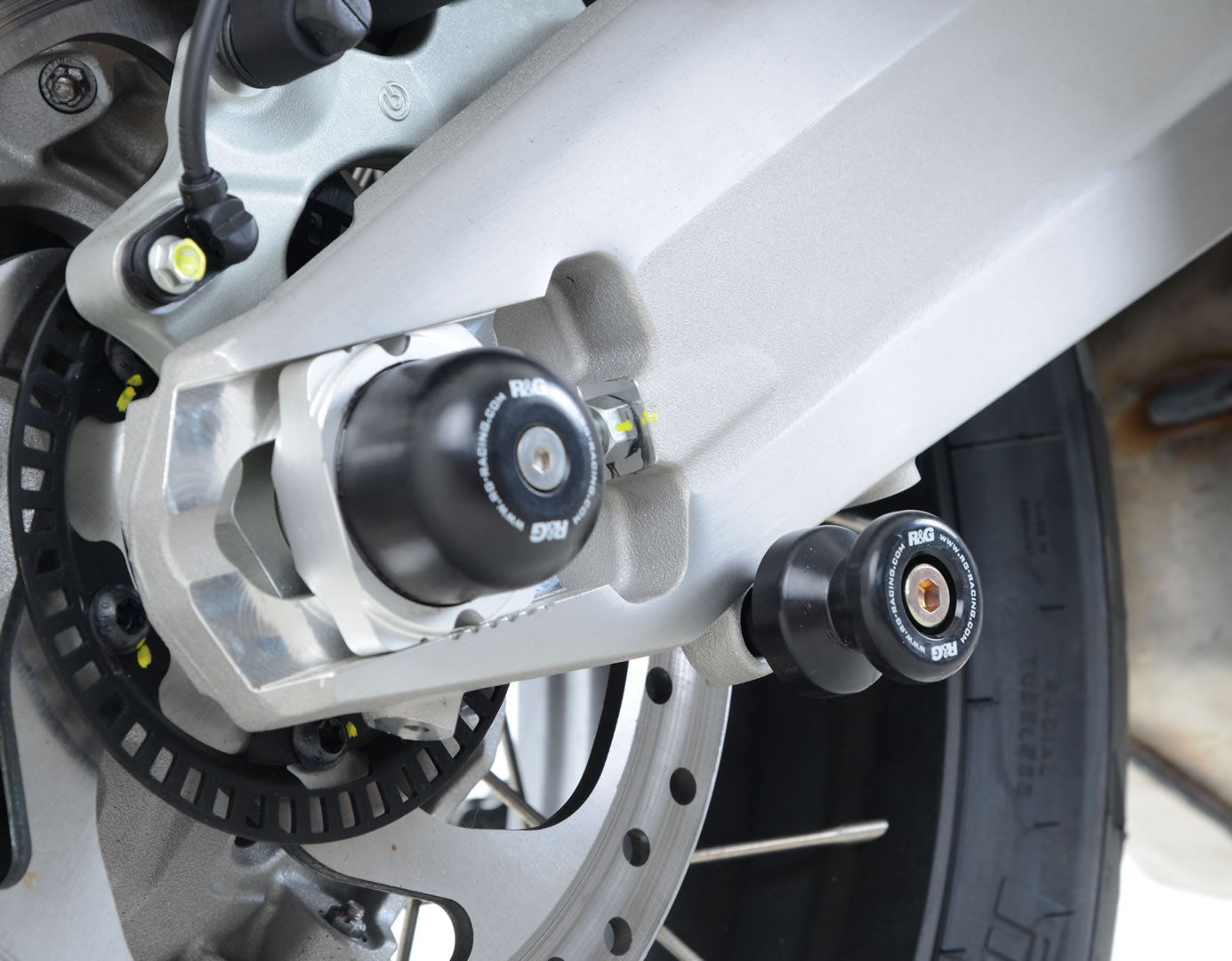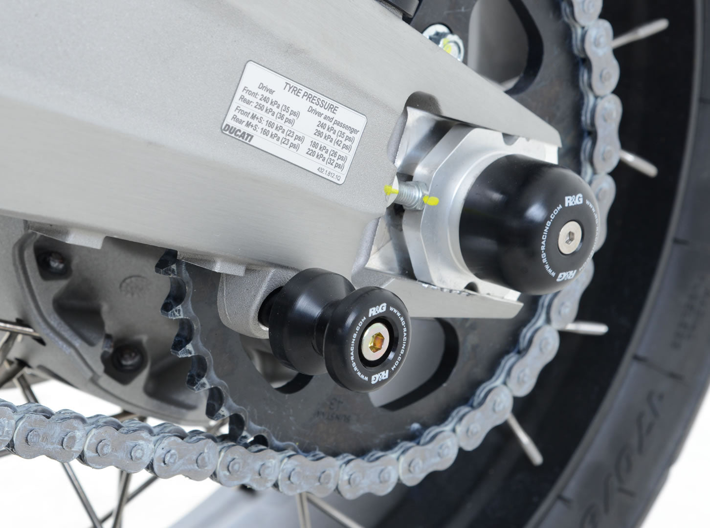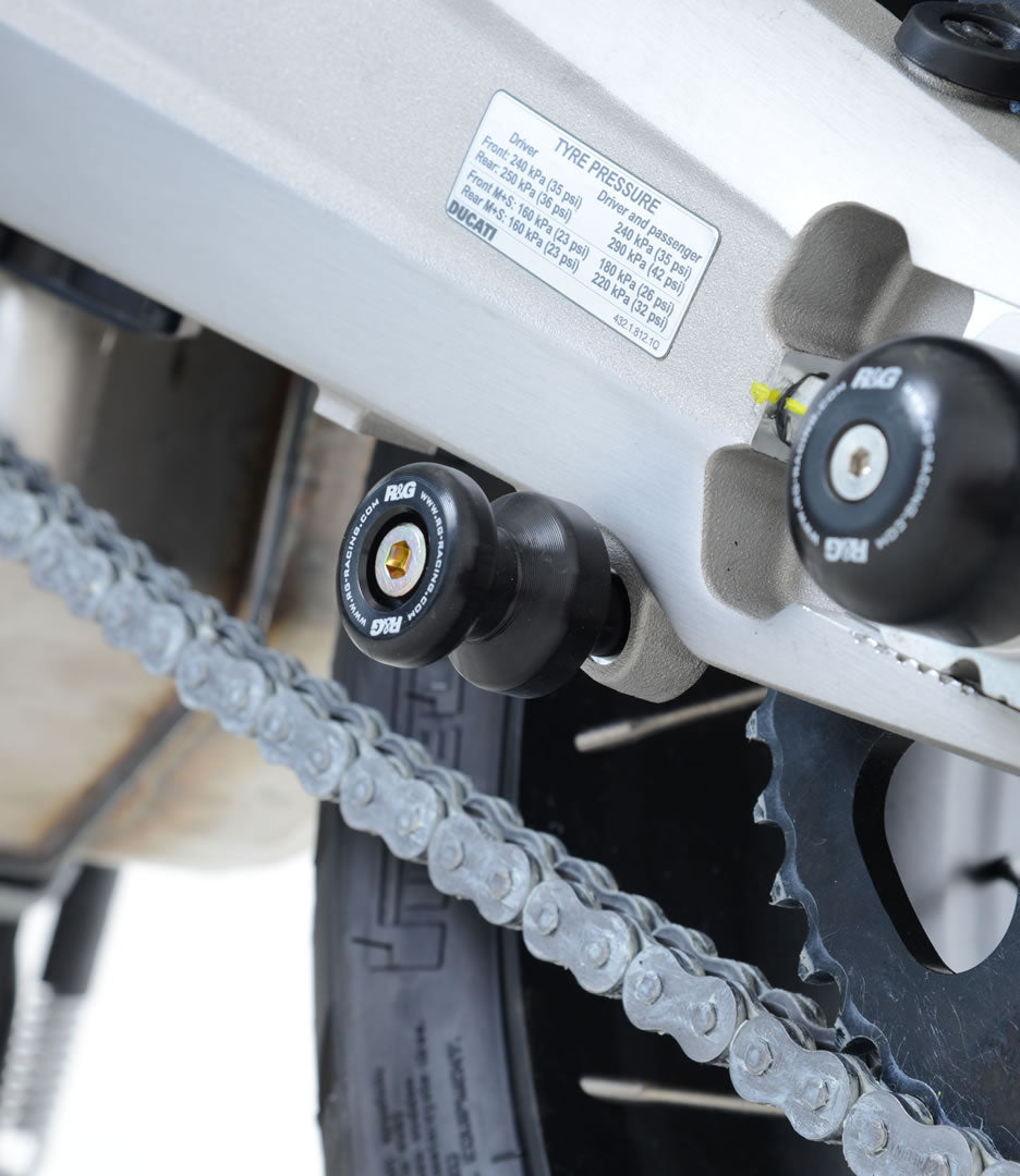 Are they cotton reels or spindle sliders? Well they are both really!! The Cotton Reel protects the swingarm and swingarm core components in the event of a crash or drop, but also double up as paddock stand bobbins. Allowing the motorcycles rear wheel to be lifted into the air via a paddock stand to performance chain adjustment, tyre changes and cleaning! This particular pair of R&G Cotton Reels are compatible with the Ducati Multistrada 1200 Enduro '16 & Multistrada 950 '17-19. Please Note: Swingarm Protectors (shown through rear spindle) IS NOT included but is available seperately (SKU: SP0054BK).