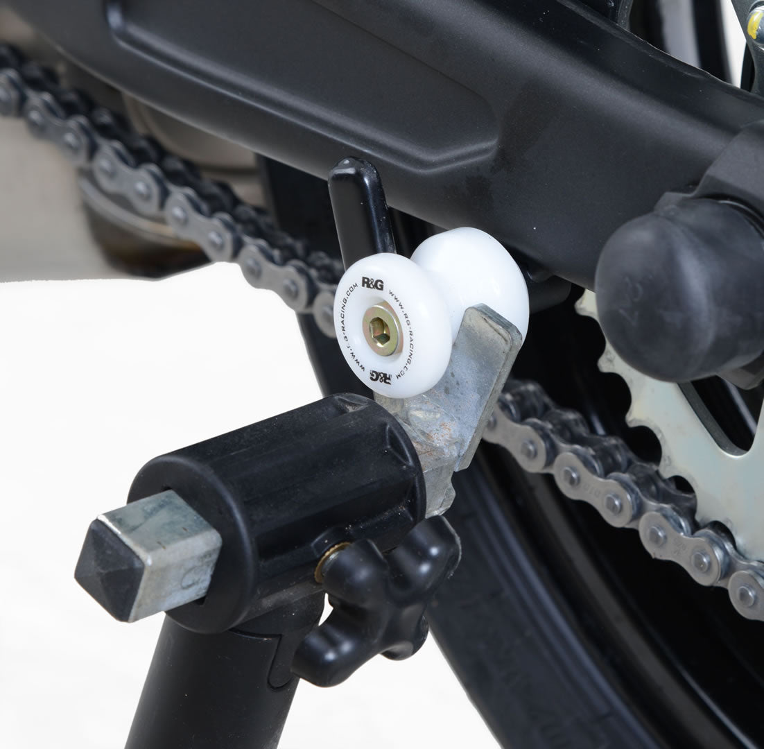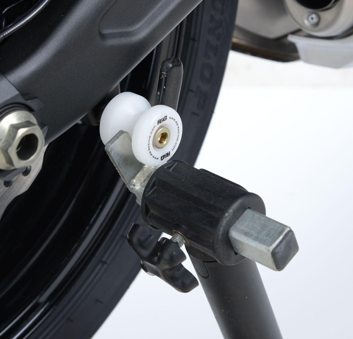 R&G Cotton Reels locate on the paddock stand mounting points on the rear swingarm, offering protection and functionality in one product. Protecting the swingarm and drive components - keeping them off the ground in case of a crash or drop, as well as working as paddock stand points for lifting the rear of the bike onto a paddock stand for tyre removal, chain adjusting/lubrication and bike cleaning!
