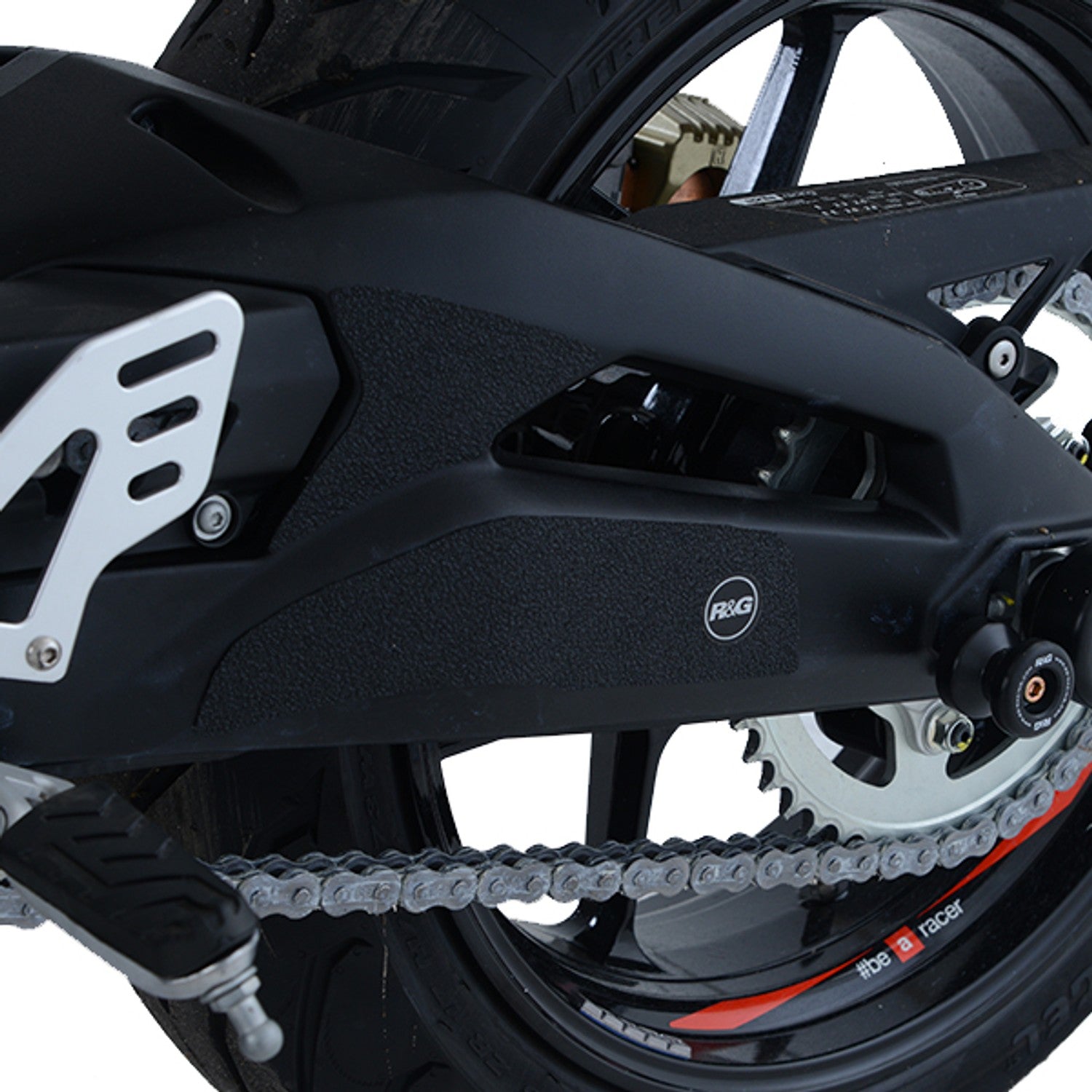 R&G Boot Guard kits are available for a large range of bike styles and brands, with new applications released regularly. The unique R&G texture was specifically designed to be durable, providing the rider with a buffer between his boot on the exposed areas of the swingarm which can (on occasion) come into contact with each other during cornering causing wear and unwanted damage to the swingarm or boots (both expensive to fix!). Each Boot Guard kit is supplied with precision pre-cut adhesive pieces, designed to fit the intended bike, typically in either 2 or 4 pieces depending on the shape of the swingarm. The high-strength adhesive backing ensures a highly durable product that will stay exactly where you put it, as well as not affecting or damaging paintwork. This 5pcs Boot Guard kit has been specially designed for the Aprilia Shiver 900 '18- models, protecting the swingarm from unwanted scuffs and marks.