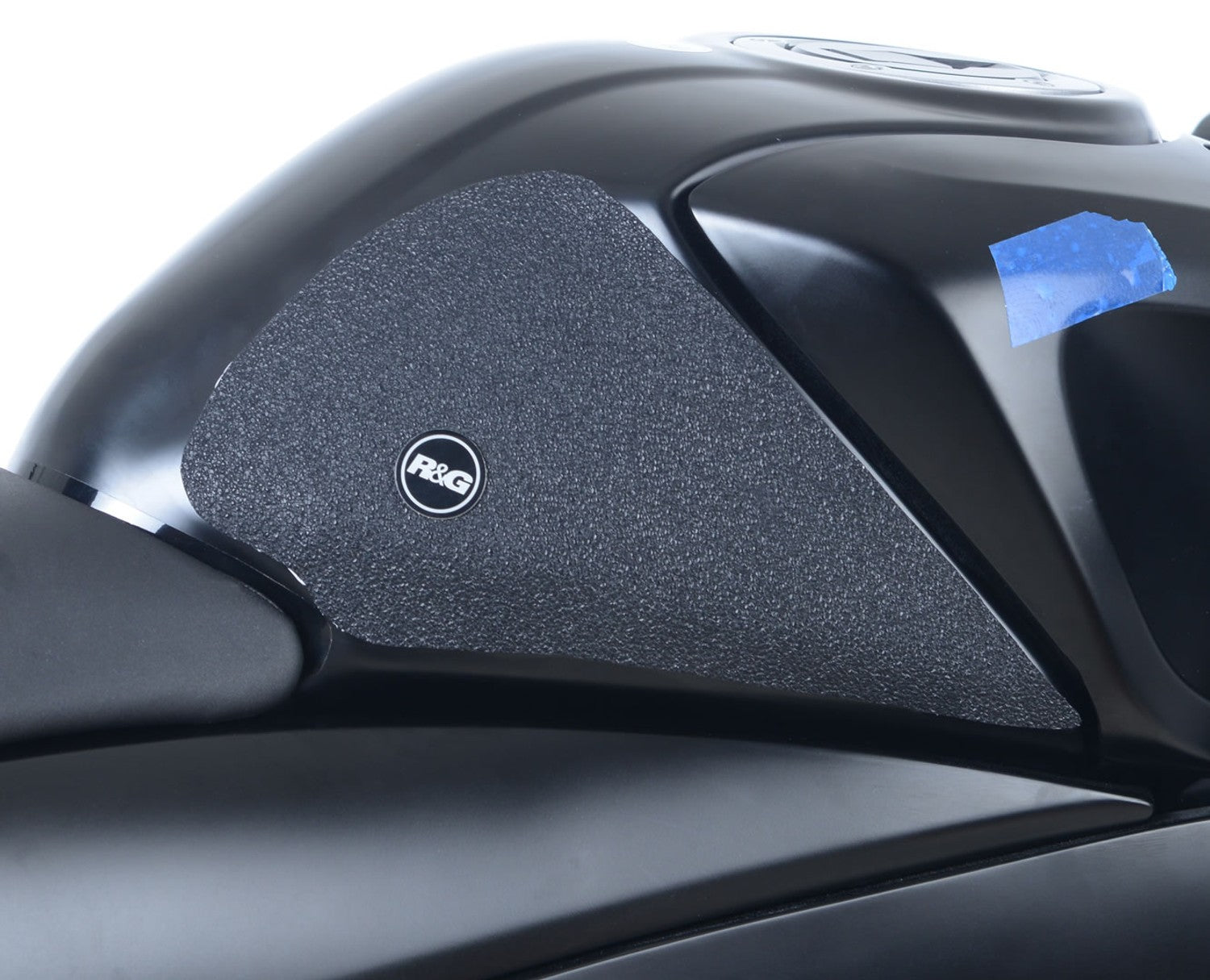 R&G Tank Traction Grip kits are available for many different bike styles and brands, with new applications released regularly. The unique R&G texture was specifically designed to be both soft and durable, providing the rider with the grip and feel he/she needs to assist in better bike control, enabling the rider to maintain a stable body position while cornering and braking, whilst also relieving fatigue and providing the rider with complete confidence allowing him/her to fully focus on the road (or track) ahead instead of slipping and sliding on the tank. Each Tank Traction Grip kit is supplied with precision pre-cut adhesive pieces, designed to fit the intended bike, typically in either 2, 4 or 6 pieces (in total) depending on the shape of the tank and adjoining fairing. The high-strength adhesive backing ensures a highly durable product that will stay exactly where you put it, as well as not affecting or damaging paintwork. Each R&G Tank Traction Grip kit is available in black and ultra-clear finishes to blend into your bike’s paintwork or stand out, depending on your preference. R&G Tank Traction Grips work in both wet and dry conditions and is equally at home on the track as it is on the commute home!