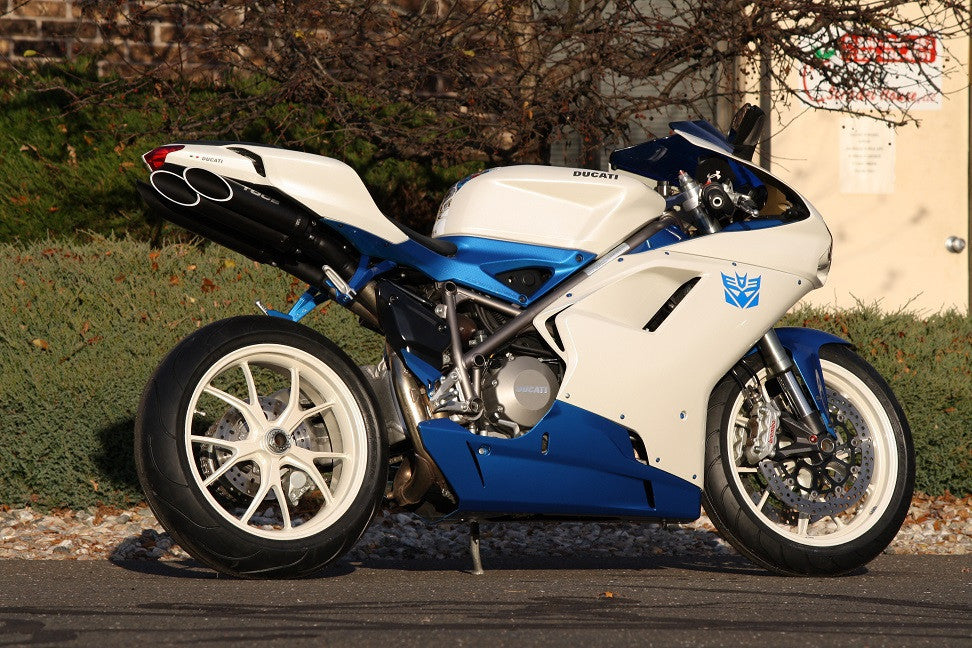 Designed to follow the contour of the Ducati tail section, to avoid melting or discoloring the tail light. Each Muffler is made from Billet Aluminum that is then Welded and Blended carefully with the Stainless connecting Pipes to make a Unique Muffler