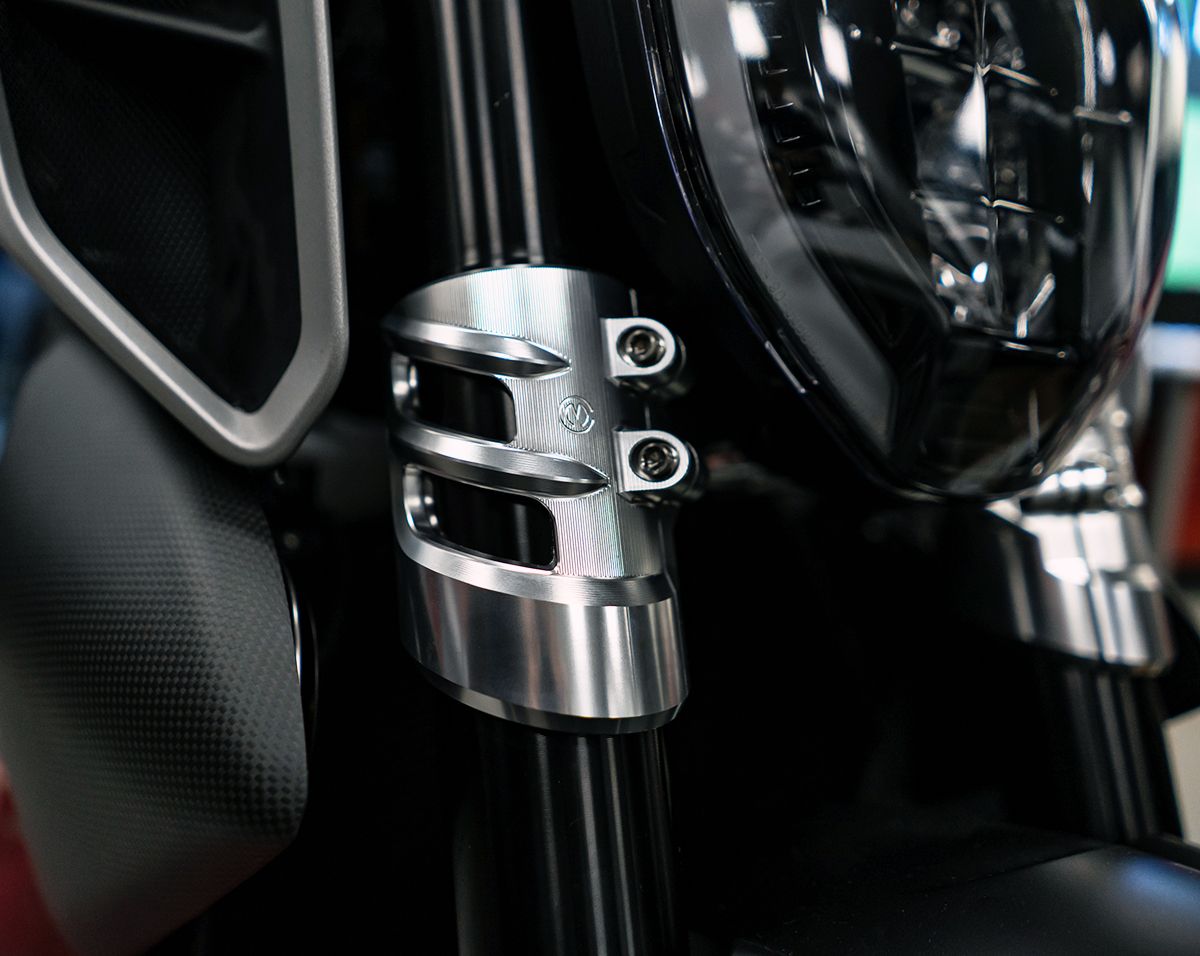 The Motocorse lower steering triple clamp for Ducati Diavel V4 is machined from a solid block of aluminum alloy using