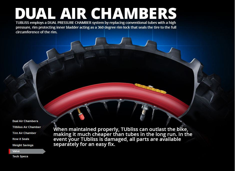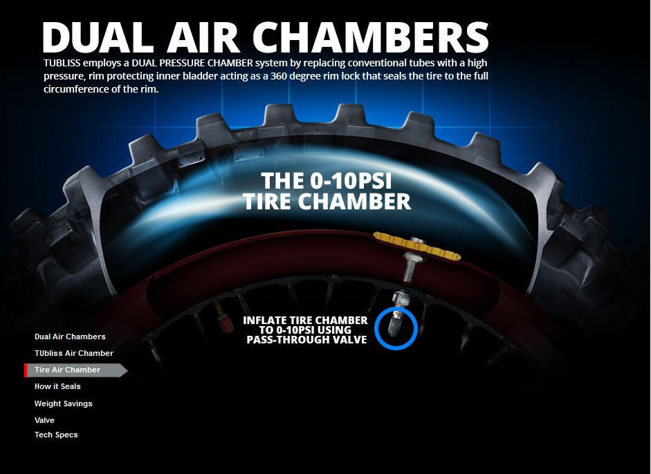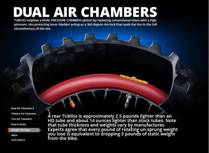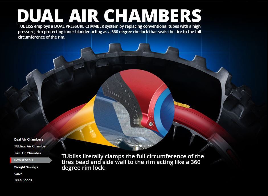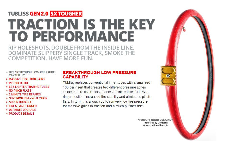 The Nuetech Tubliss 2.0 Kit replaces conventional inner tubes with a small red insert that creates two different pressure zones inside the tire itself. This enables an incredible 100 PSI of rim protection, increased tire stability, and eliminates pinch flats. The Tubliss system also allows you to run much lower tire pressures than you normally would with a standard tube. The lower tire pressure creates a larger contact patch, leading to greatly improved traction and a plusher ride.