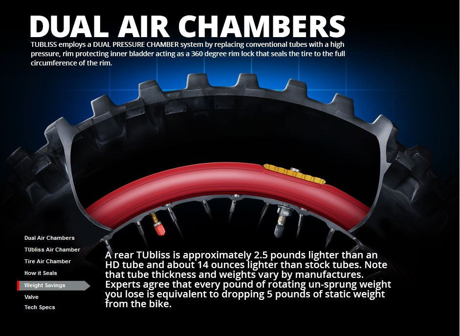 Weight savings on a rear wheel compared to a standard pinch prone tube is about one pound, and can be 2 to 3 pounds lighter than some heavy duty tubes. Saving weight in the wheels is one of the most important places to save weight, and is often overlooked because of limited options. A lighter wheel will help reduce rotating mass, improve acceleration, braking, and the overall handling of your machine.