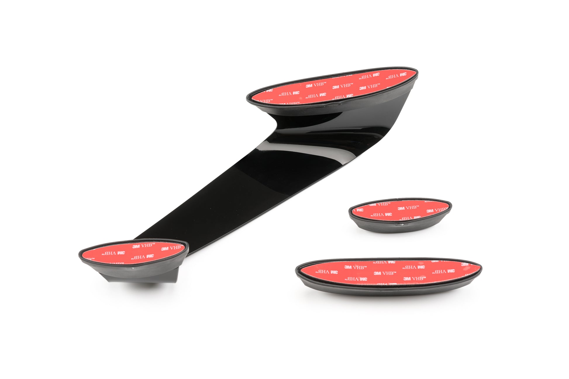 They are made up of two elements: supports injected in flexible plastic that adapt perfectly to the fairing of your motorcycle by means of a 3M dual lock adhesive, strong, resistant and durable, but that can be removed and does not damage or require holes in your fairing. And the second element is a closed-shaped spoiler, which is made of 4mm high-impact acrylic material following safety regulations, with rounded edges with a radius> 2mm, a material of great rigidity and lightness, perfect for receiving aerodynamic pressure and directly translating it into downforce.