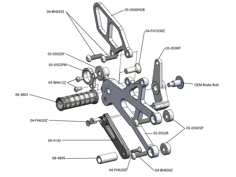The complete rearset kit consists of the rearset plates, footpegs, 3 piece billet pedals and all of the needed hardware (shift rods, etc) to install the kit properly. This kit has adjustable eccentric pegs for a custom fit thats both comfortable and durable. They are made from tough, aircraft grade 6061 T6 Aluminum. They are much stronger than OEM brackets and will give your bike a look that will separate you from the crowd. This kit is designed for the new 675 to give you the optimum foot position and ground clearance for racing and has already been tested and tried on the track. In the event that you need replacement parts, any individual piece of this kit is available under the "Spare Parts" tab.